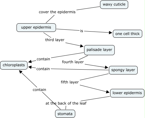 This Concept Map, created with IHMC CmapTools, has information related to: ldz, palisade layer fourth layer spongy layer, palisade layer contain chloroplasts, upper epidermis is one cell thick, lower epidermis at the back of the leaf stomata, upper epidermis third layer palisade layer, waxy cuticle cover the epidermis upper epidermis, spongy layer contain chloroplasts, stomata contain chloroplasts, spongy layer fifth layer lower epidermis