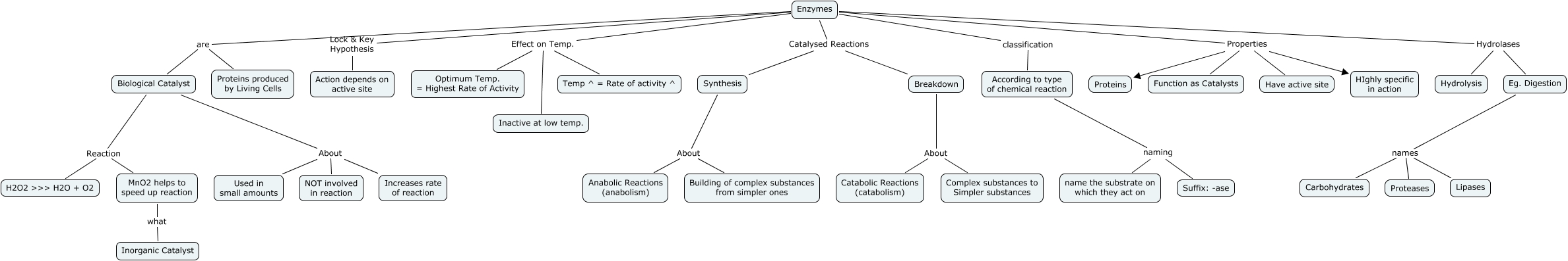 This Concept Map, created with IHMC CmapTools, has information related to: Enzymes (Nicholas Lim), Breakdown About Complex substances to Simpler substances, Enzymes Properties Have active site, Enzymes Effect on Temp. Temp ^ = Rate of activity ^, Synthesis About Anabolic Reactions (anabolism), Enzymes Properties Proteins, Enzymes are Biological Catalyst, Eg. Digestion names Lipases, Enzymes Lock & Key Hypothesis Action depends on active site, MnO2 helps to speed up reaction what Inorganic Catalyst, Eg. Digestion names Carbohydrates, Enzymes Hydrolases Hydrolysis, Biological Catalyst About Used in small amounts, Enzymes Catalysed Reactions Breakdown, Enzymes Properties HIghly specific in action, Enzymes Hydrolases Eg. Digestion, Enzymes are Proteins produced by Living Cells, Enzymes Catalysed Reactions Synthesis, Enzymes Effect on Temp. Inactive at low temp., According to type of chemical reaction naming Suffix: -ase, Breakdown About Catabolic Reactions (catabolism)