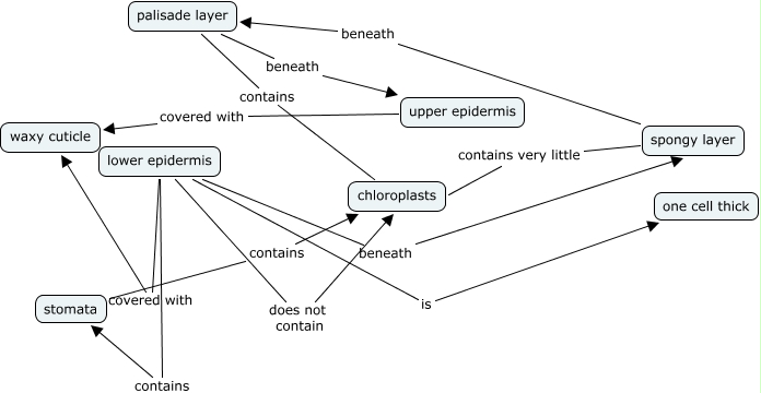 This Concept Map, created with IHMC CmapTools, has information related to: joseph1, spongy layer contains very little chloroplasts, upper epidermis covered with waxy cuticle, stomata contains chloroplasts, lower epidermis is one cell thick, lower epidermis covered with waxy cuticle, palisade layer beneath upper epidermis, lower epidermis contains stomata, lower epidermis beneath spongy layer, spongy layer beneath palisade layer, lower epidermis does not contain chloroplasts, palisade layer contains chloroplasts