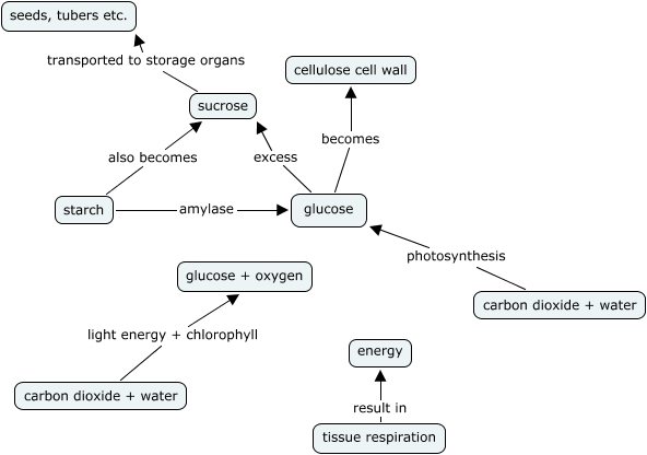 This Concept Map, created with IHMC CmapTools, has information related to: totototonio, carbon dioxide + water photosynthesis glucose, glucose becomes cellulose cell wall, starch also becomes sucrose, carbon dioxide + water light energy + chlorophyll glucose + oxygen, sucrose transported to storage organs seeds, tubers etc., glucose excess sucrose, starch amylase glucose, tissue respiration result in energy