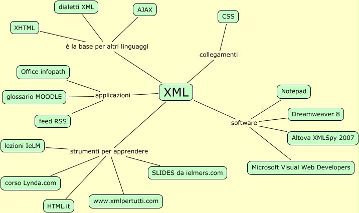 Dieses mit IHMC CmapTools erstellte CMap hat Informationen bezüglich: XML, XML collegamenti CSS, XML software Dreamweaver 8, XML strumenti per apprendere corso Lynda.com, XML è la base per altri linguaggi AJAX, XML è la base per altri linguaggi dialetti XML, XML software Microsoft Visual Web Developers, XML strumenti per apprendere HTML.it, XML strumenti per apprendere lezioni IeLM, XML applicazioni feed RSS, XML applicazioni glossario MOODLE, XML software Notepad, XML strumenti per apprendere www.xmlpertutti.com, XML software Altova XMLSpy 2007, XML è la base per altri linguaggi XHTML, XML applicazioni Office infopath, XML strumenti per apprendere SLIDES da ielmers.com