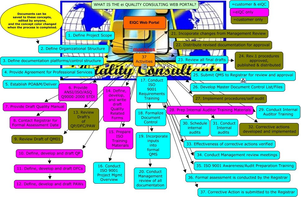 This Concept Map, created with IHMC CmapTools, has information related to: EIQC Web Portal, EIQC Web Portal manages 25. Submit QMS to Registrar for review and approval, EIQC Web Portal manages 2. Define Organizational Structure, EIQC Web Portal manages 24. Rev.1 procedures approved, published & distributed, EIQC Web Portal manages 1. Define Project Scope, EIQC Web Portal manages 28. Prep Internal Auditor Training Materials, EIQC Web Portal manages 32. Corrective actions developed and implemented, EIQC Web Portal manages 36. Formal assessment is conducted by the Registrar, EIQC Web Portal manages 33. Effectiveness of corrective actions verified, EIQC Web Portal manages 21. Incoporate changes from Management Review, EIQC Web Portal manages 7. Provide Draft Quality Manual, EIQC Web Portal manages 35. ISO 9001 Awareness/Audit Preparation Training, EIQC Web Portal manages 16. Conduct ISO 9001 Project Mgmt Overview, EIQC Web Portal manages 17. Conduct ISO 9001 Requirements Training, EIQC Web Portal manages 13. Review Draft's of QP/DFC/PAW, EIQC Web Portal manages 34. Conduct Management review meetings, EIQC Web Portal manages 18. Formalize Document Control, EIQC Web Portal manages 22. Distribute revised documentation for approval, EIQC Web Portal manages 9. Review Draft of QM01, EIQC Web Portal manages 5. Establish POA&M/Deliver, EIQC Web Portal manages 15. Prepare ISO Training Materials