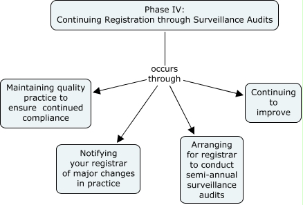 This Concept Map, created with IHMC CmapTools, has information related to: Phase IV Continuing Registration through Surveillance Audits, Phase IV: Continuing Registration through Surveillance Audits occurs through Continuing to improve, Phase IV: Continuing Registration through Surveillance Audits occurs through Notifying your registrar of major changes in practice, Phase IV: Continuing Registration through Surveillance Audits occurs through Arranging for registrar to conduct semi-annual surveillance audits, Phase IV: Continuing Registration through Surveillance Audits occurs through Maintaining quality practice to ensure continued compliance