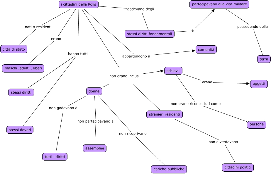 This Concept Map, created with IHMC CmapTools, has information related to: jessica, i cittadini della Polis non erano inclusi stranieri residenti, i cittadini della Polis appartengono a comunità, i cittadini della Polis erano maschi ,adulti , liberi, i cittadini della Polis hanno tutti stessi doveri, donne non partecipavano a assemblee, schiavi erano oggetti, donne non godevano di tutti i diritti, i cittadini della Polis hanno tutti stessi diritti, i cittadini della Polis nati o residenti città di stato, partecipavano alla vita militare possedendo della terra, stranieri residenti non diventavano cittadini politici, i cittadini della Polis non erano inclusi donne, stessi diritti fondamentali e partecipavano alla vita militare, i cittadini della Polis godevano degli stessi diritti fondamentali, i cittadini della Polis non erano inclusi schiavi, schiavi non erano riconosciuti come persone, donne non ricoprivano cariche pubbliche