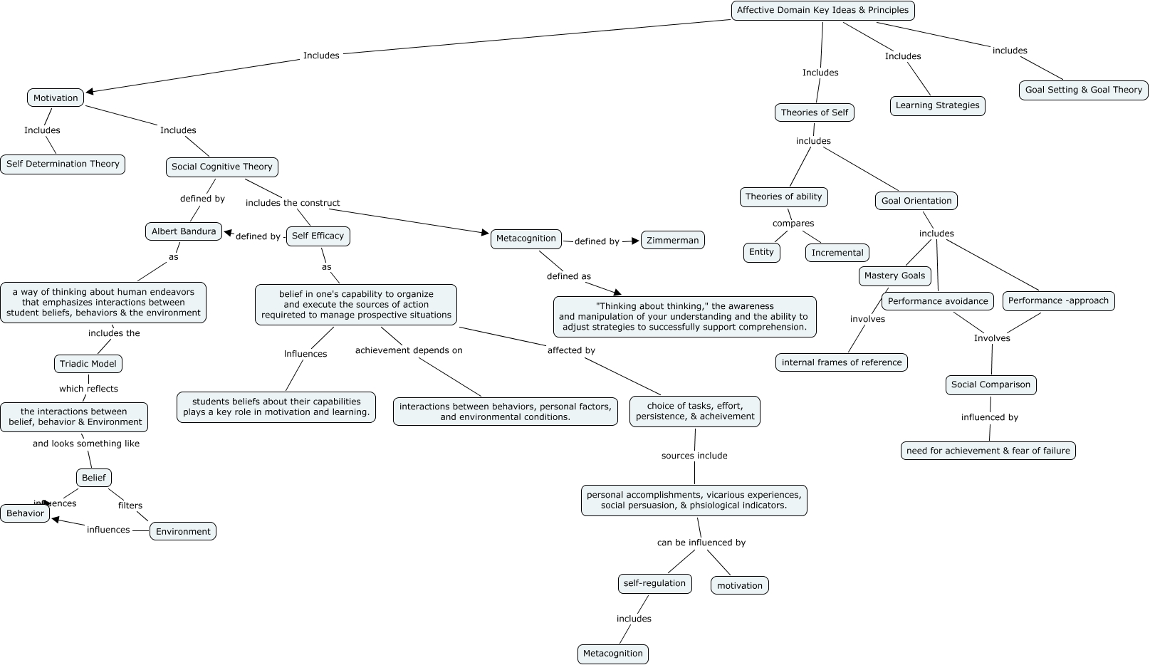 This Concept Map, created with IHMC CmapTools, has information related to: affective domain, Performance -approach Involves Social Comparison, Belief filters Environment, Belief influences Behavior, Affective Domain Key Ideas & Principles includes Goal Setting & Goal Theory, Theories of ability compares Entity, Self Efficacy defined by Albert Bandura, Performance avoidance Involves Social Comparison, personal accomplishments, vicarious experiences, social persuasion, & phsiological indicators. can be influenced by self-regulation, Theories of Self includes Goal Orientation, the interactions between belief, behavior & Environment and looks something like Belief, Environment influences Behavior, Affective Domain Key Ideas & Principles Includes Learning Strategies, Motivation Includes Social Cognitive Theory, Goal Orientation includes Performance avoidance, Metacognition defined as "Thinking about thinking," the awareness and manipulation of your understanding and the ability to adjust strategies to successfully support comprehension., Theories of ability compares Incremental, Affective Domain Key Ideas & Principles Includes Motivation, belief in one's capability to organize and execute the sources of action requireted to manage prospective situations affected by choice of tasks, effort, persistence, & acheivement, belief in one's capability to organize and execute the sources of action requireted to manage prospective situations lnfluences students beliefs about their capabilities plays a key role in motivation and learning., Social Cognitive Theory defined by Albert Bandura