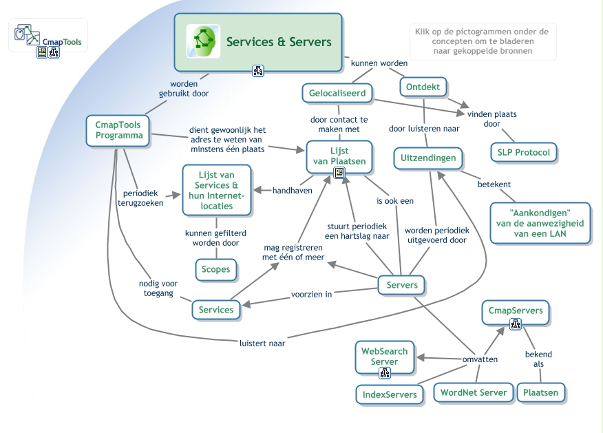 This Concept Map, created with IHMC CmapTools, has information related to: CmapTools - Localiseren & Ontdekken Services & Servers, Servers voorzien in Services, Lijst van Services & hun Internet- locaties kunnen gefilterd worden door Scopes, Servers omvatten WordNet Server, Uitzendingen worden periodiek uitgevoerd door Servers, Lijst van Plaatsen is ook een Servers, CmapTools Programma nodig voor toegang Services, Services mag registreren met één of meer Lijst van Plaatsen, CmapTools Services and Servers kunnen worden Gelocaliseerd, Uitzendingen betekent "Aankondigen" van de aanwezigheid van een LAN, Gelocaliseerd vinden plaats door SLP Protocol, CmapTools Services and Servers kunnen worden Ontdekt, Gelocaliseerd door contact te maken met Lijst van Plaatsen, Servers omvatten IndexServers, Ontdekt door luisteren naar Uitzendingen, CmapTools Programma periodiek terugzoeken Lijst van Services & hun Internet- locaties, CmapTools Services and Servers worden gebruikt door CmapTools Programma, Servers omvatten CmapServers, CmapTools Programma dient gewoonlijk het adres te weten van minstens één plaats Lijst van Plaatsen, Lijst van Plaatsen handhaven Lijst van Services & hun Internet- locaties, Servers omvatten WebSearch Server