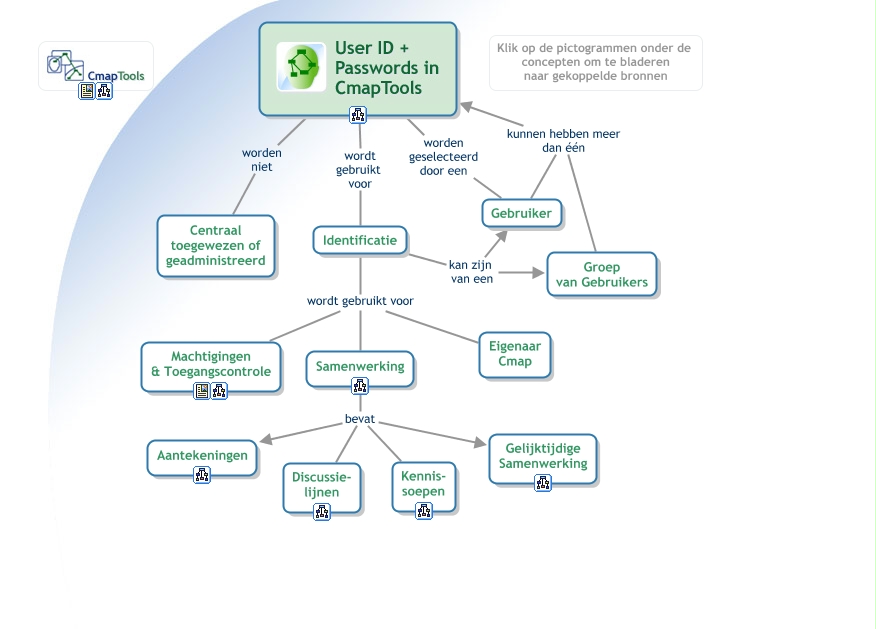 This Concept Map, created with IHMC CmapTools, has information related to: CmapTools - Gebruikers-ID en wachtwoorden, User ID + Passwords in CmapTools worden geselecteerd door een Gebruiker, Identificatie wordt gebruikt voor Samenwerking, Samenwerking bevat Kennis- soepen, Groep van Gebruikers kunnen hebben meer dan één User ID + Passwords in CmapTools, Identificatie kan zijn van een Groep van Gebruikers, Identificatie wordt gebruikt voor Machtigingen & Toegangscontrole, Identificatie wordt gebruikt voor Eigenaar Cmap, User ID + Passwords in CmapTools wordt gebruikt voor Identificatie, Samenwerking bevat Gelijktijdige Samenwerking, Samenwerking bevat Discussie- lijnen, Samenwerking bevat Aantekeningen, User ID + Passwords in CmapTools worden niet Centraal toegewezen of geadministreerd, Identificatie kan zijn van een Gebruiker, Gebruiker kunnen hebben meer dan één User ID + Passwords in CmapTools