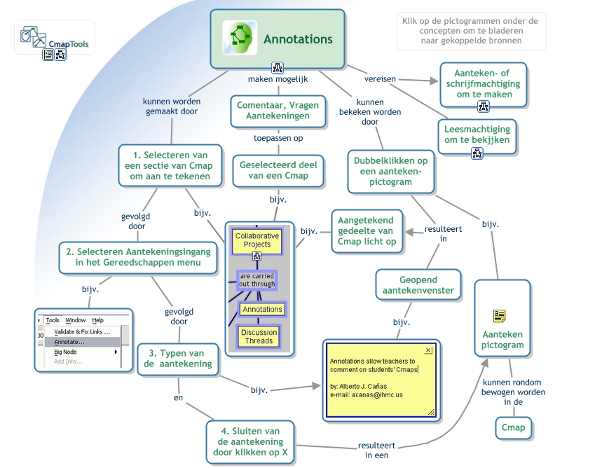 This Concept Map, created with IHMC CmapTools, has information related to: CmapTools - Aantekeningen, 1. Selecteren van een sectie van Cmap om aan te tekenen gevolgd door 2. Selecteren Aantekeningsingang in het Gereedschappen menu, Aaaaad Annotations kunnen worden gemaakt door 1. Selecteren van een sectie van Cmap om aan te tekenen, Comentaar, Vragen Aantekeningen toepassen op Geselecteerd deel van een Cmap, 3. Typen van de aantekening en 4. Sluiten van de aantekening door klikken op X, Dubbelklikken op een aanteken- pictogram bijv. Aanteken pictogram, 3. Typen van de aantekening bijv., Aanteken pictogram kunnen rondom bewogen worden in de Cmap, Dubbelklikken op een aanteken- pictogram resulteert in Geopend aantekenvenster, 1. Selecteren van een sectie van Cmap om aan te tekenen bijv., Aaaaad Annotations vereisen Leesmachtiging om te bekjjken, Geopend aantekenvenster bijv., Aaaaad Annotations vereisen Aanteken- of schrijfmachtiging om te maken, Geselecteerd deel van een Cmap bijv., Aaaaad Annotations maken mogelijk Comentaar, Vragen Aantekeningen, Aaaaad Annotations kunnen bekeken worden door Dubbelklikken op een aanteken- pictogram, 4. Sluiten van de aantekening door klikken op X resulteert in een Aanteken pictogram, Aangetekend gedeelte van Cmap licht op bijv., Dubbelklikken op een aanteken- pictogram resulteert in Aangetekend gedeelte van Cmap licht op, 2. Selecteren Aantekeningsingang in het Gereedschappen menu bijv., 2. Selecteren Aantekeningsingang in het Gereedschappen menu gevolgd door 3. Typen van de aantekening