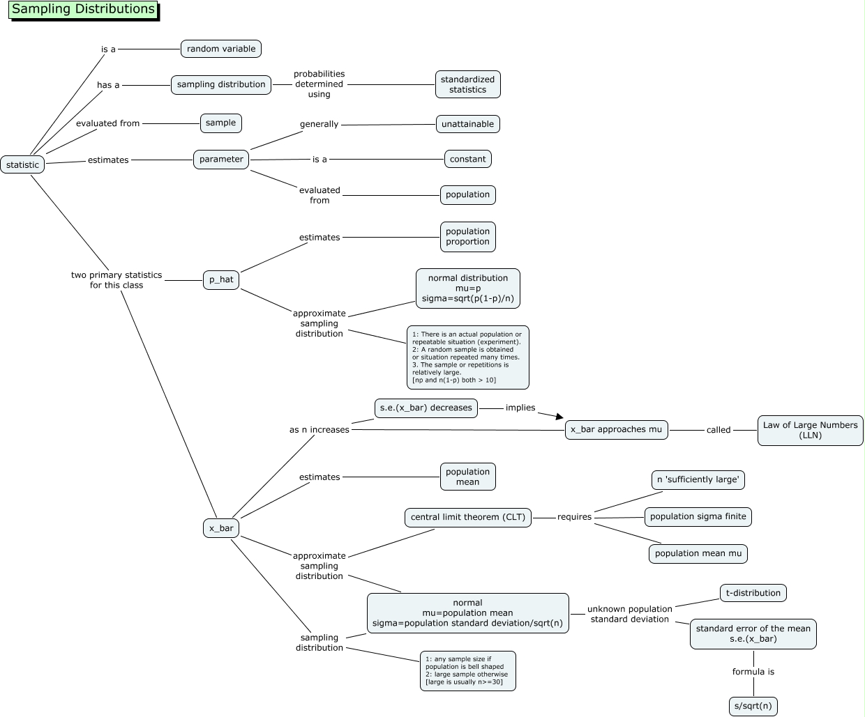 This Concept Map, created with IHMC CmapTools, has information related to: SamplingDistributions, statistic two primary statistics for this class x_bar, p_hat estimates population proportion, normal mu=population mean sigma=population standard deviation/sqrt(n) unknown population standard deviation t-distribution, standard error of the mean s.e.(x_bar) formula is s/sqrt(n), parameter is a constant, statistic estimates parameter, statistic has a sampling distribution, x_bar approximate sampling distribution central limit theorem (CLT), central limit theorem (CLT) requires population sigma finite, x_bar as n increases s.e.(x_bar) decreases, statistic evaluated from sample, x_bar as n increases x_bar approaches mu, statistic two primary statistics for this class p_hat, parameter evaluated from population, x_bar approximate sampling distribution normal mu=population mean sigma=population standard deviation/sqrt(n), central limit theorem (CLT) requires population mean mu, statistic is a random variable, x_bar sampling distribution 1: any sample size if population is bell shaped 2: large sample otherwise [large is usually n>=30], central limit theorem (CLT) requires n 'sufficiently large', normal mu=population mean sigma=population standard deviation/sqrt(n) unknown population standard deviation standard error of the mean s.e.(x_bar)