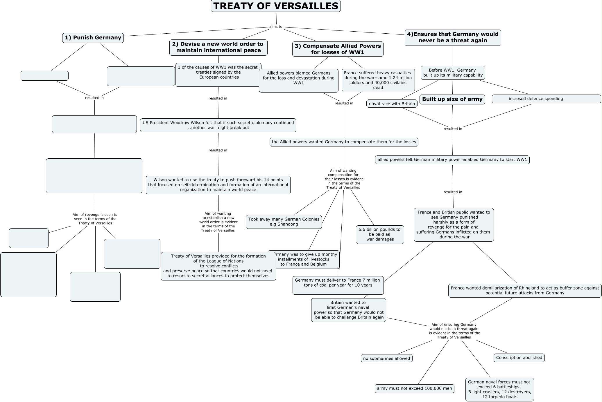 This Concept Map, created with IHMC CmapTools, has information related to: 3i oliver koh, France and British public wanted to see Germany punished harshly as a form of revenge for the pain and suffering Germans inflicted on them during the war France wanted demiliarization of Rhineland to act as buffer zone against potential future attacks from Germany, resulted in, 1) Punish Germany, France and British public wanted to see Germany punished harshly as a form of revenge for the pain and suffering Germans inflicted on them during the war Britain wanted to limit German's naval power so that Germany would not be able to challange Britain again, TREATY OF VERSAILLES aims to 4)Ensures that Germany would never be a threat again, France wanted demiliarization of Rhineland to act as buffer zone against potential future attacks from Germany Aim of ensuring Germany would not be a threat again is evident in the terms of the Treaty of Versailles German naval forces must not exceed 6 battleships, 6 light crusiers, 12 destroyers, 12 torpedo boats, TREATY OF VERSAILLES aims to 1) Punish Germany, France wanted demiliarization of Rhineland to act as buffer zone against potential future attacks from Germany Aim of ensuring Germany would not be a threat again is evident in the terms of the Treaty of Versailles no submarines allowed, Aim of revenge is seen is seen in the terms of the Treaty of Versailles, Before WW1, Germany built up its military capability naval race with Britain, the Allied powers wanted Germany to compensate them for the losses Aim of wanting compensation for their losses is evident in the terms of the Treaty of Versailles Germany was to give up monthy installments of livestocks to France and Belgium, France wanted demiliarization of Rhineland to act as buffer zone against potential future attacks from Germany Aim of ensuring Germany would not be a threat again is evident in the terms of the Treaty of Versailles army must not exceed 100,000 men, resulted in, the Allied powers wanted Germany to compensate them for the losses Aim of wanting compensation for their losses is evident in the terms of the Treaty of Versailles 6.6 billion pounds to be paid as war damages, Allied powers blamed Germans for the loss and devastation during WW1 resulted in the Allied powers wanted Germany to compensate them for the losses, the Allied powers wanted Germany to compensate them for the losses Aim of wanting compensation for their losses is evident in the terms of the Treaty of Versailles Took away many German Colonies e.g Shandong, US President Woodrow Wilson felt that if such secret diplomacy continued , another war might break out resulted in Wilson wanted to use the treaty to push foreward his 14 points that focused on self-determination and formation of an international organization to maintain world peace, Britain wanted to limit German's naval power so that Germany would not be able to challange Britain again Aim of ensuring Germany would not be a threat again is evident in the terms of the Treaty of Versailles army must not exceed 100,000 men, Britain wanted to limit German's naval power so that Germany would not be able to challange Britain again Aim of ensuring Germany would not be a threat again is evident in the terms of the Treaty of Versailles Conscription abolished,