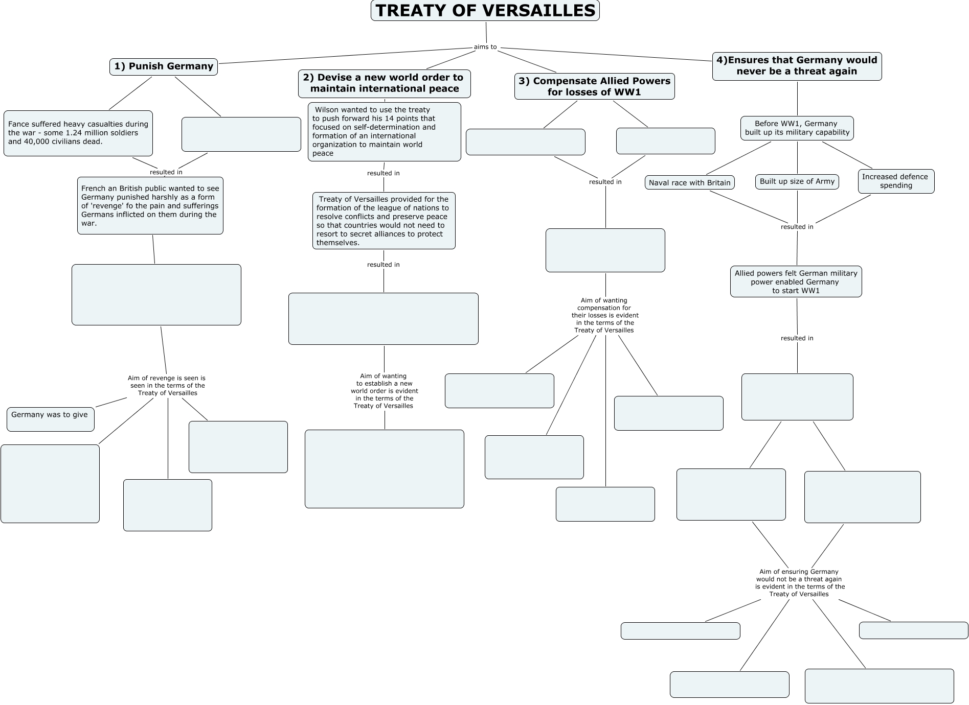 This Concept Map, created with IHMC CmapTools, has information related to: 3I Goh Chang Jun,, Fance suffered heavy casualties during the war - some 1.24 million soldiers and 40,000 civilians dead. resulted in French an British public wanted to see Germany punished harshly as a form of 'revenge' fo the pain and sufferings Germans inflicted on them during the war., Before WW1, Germany built up its military capability Built up size of Army, 1) Punish Germany Fance suffered heavy casualties during the war - some 1.24 million soldiers and 40,000 civilians dead.,, TREATY OF VERSAILLES aims to 4)Ensures that Germany would never be a threat again, Aim of ensuring Germany would not be a threat again is evident in the terms of the Treaty of Versailles, TREATY OF VERSAILLES aims to 1) Punish Germany, Aim of ensuring Germany would not be a threat again is evident in the terms of the Treaty of Versailles, Aim of revenge is seen is seen in the terms of the Treaty of Versailles Germany was to give, Before WW1, Germany built up its military capability Naval race with Britain, Aim of wanting compensation for their losses is evident in the terms of the Treaty of Versailles, Aim of ensuring Germany would not be a threat again is evident in the terms of the Treaty of Versailles, resulted in French an British public wanted to see Germany punished harshly as a form of 'revenge' fo the pain and sufferings Germans inflicted on them during the war., Aim of wanting compensation for their losses is evident in the terms of the Treaty of Versailles, resulted in, Aim of wanting compensation for their losses is evident in the terms of the Treaty of Versailles, Treaty of Versailles provided for the formation of the league of nations to resolve conflicts and preserve peace so that countries would not need to resort to secret alliances to protect themselves. resulted in, Aim of ensuring Germany would not be a threat again is evident in the terms of the Treaty of Versailles, Aim of ensuring Germany would not be a threat again is evident in the terms of the Treaty of Versailles