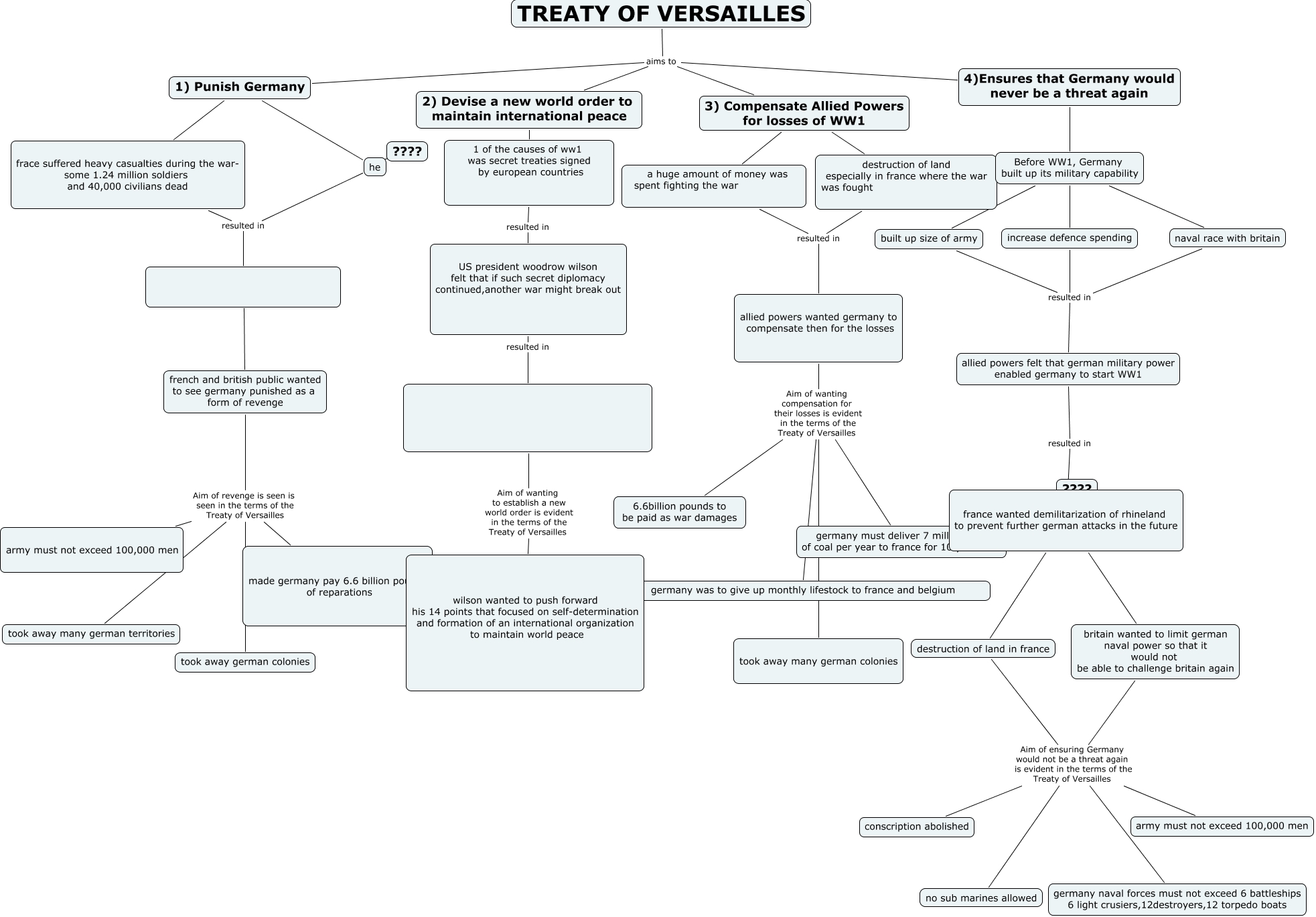 This Concept Map, created with IHMC CmapTools, has information related to: 3j hao qi, france wanted demilitarization of rhineland to prevent further german attacks in the future britain wanted to limit german naval power so that it would not be able to challenge britain again, frace suffered heavy casualties during the war- some 1.24 million soldiers and 40,000 civilians dead resulted in, Before WW1, Germany built up its military capability increase defence spending, 1) Punish Germany frace suffered heavy casualties during the war- some 1.24 million soldiers and 40,000 civilians dead, france wanted demilitarization of rhineland to prevent further german attacks in the future destruction of land in france, TREATY OF VERSAILLES aims to 4)Ensures that Germany would never be a threat again, britain wanted to limit german naval power so that it would not be able to challenge britain again Aim of ensuring Germany would not be a threat again is evident in the terms of the Treaty of Versailles germany naval forces must not exceed 6 battleships 6 light crusiers,12destroyers,12 torpedo boats, TREATY OF VERSAILLES aims to 1) Punish Germany, britain wanted to limit german naval power so that it would not be able to challenge britain again Aim of ensuring Germany would not be a threat again is evident in the terms of the Treaty of Versailles conscription abolished, french and british public wanted to see germany punished as a form of revenge Aim of revenge is seen is seen in the terms of the Treaty of Versailles army must not exceed 100,000 men, Before WW1, Germany built up its military capability built up size of army, allied powers wanted germany to compensate then for the losses Aim of wanting compensation for their losses is evident in the terms of the Treaty of Versailles germany was to give up monthly lifestock to france and belgium, he ???? ????, britain wanted to limit german naval power so that it would not be able to challenge britain again Aim of ensuring Germany would not be a threat again is evident in the terms of the Treaty of Versailles no sub marines allowed, he resulted in, allied powers wanted germany to compensate then for the losses Aim of wanting compensation for their losses is evident in the terms of the Treaty of Versailles germany must deliver 7 million tons of coal per year to france for 10 years, a huge amount of money was spent fighting the war resulted in allied powers wanted germany to compensate then for the losses, allied powers wanted germany to compensate then for the losses Aim of wanting compensation for their losses is evident in the terms of the Treaty of Versailles 6.6billion pounds to be paid as war damages, US president woodrow wilson felt that if such secret diplomacy continued,another war might break out resulted in, destruction of land in france Aim of ensuring Germany would not be a threat again is evident in the terms of the Treaty of Versailles no sub marines allowed