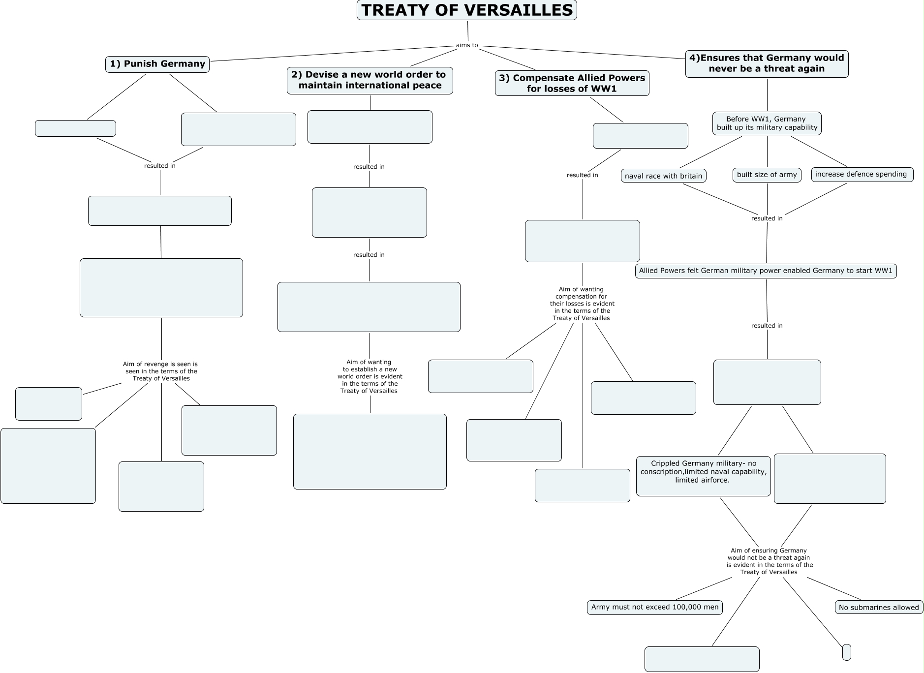 This Concept Map, created with IHMC CmapTools, has information related to: 3I tay conghan, Aim of wanting to establish a new world order is evident in the terms of the Treaty of Versailles, 1) Punish Germany, TREATY OF VERSAILLES aims to 3) Compensate Allied Powers for losses of WW1, Aim of revenge is seen is seen in the terms of the Treaty of Versailles, resulted in, Crippled Germany military- no conscription,limited naval capability, limited airforce. Aim of ensuring Germany would not be a threat again is evident in the terms of the Treaty of Versailles Army must not exceed 100,000 men, Aim of wanting compensation for their losses is evident in the terms of the Treaty of Versailles, Aim of ensuring Germany would not be a threat again is evident in the terms of the Treaty of Versailles Army must not exceed 100,000 men, Aim of revenge is seen is seen in the terms of the Treaty of Versailles, resulted in, increase defence spending resulted in Allied Powers felt German military power enabled Germany to start WW1, Before WW1, Germany built up its military capability naval race with britain, Aim of wanting compensation for their losses is evident in the terms of the Treaty of Versailles, Aim of revenge is seen is seen in the terms of the Treaty of Versailles, resulted in, Aim of revenge is seen is seen in the terms of the Treaty of Versailles, built size of army resulted in Allied Powers felt German military power enabled Germany to start WW1,,, Crippled Germany military- no conscription,limited naval capability, limited airforce. Aim of ensuring Germany would not be a threat again is evident in the terms of the Treaty of Versailles
