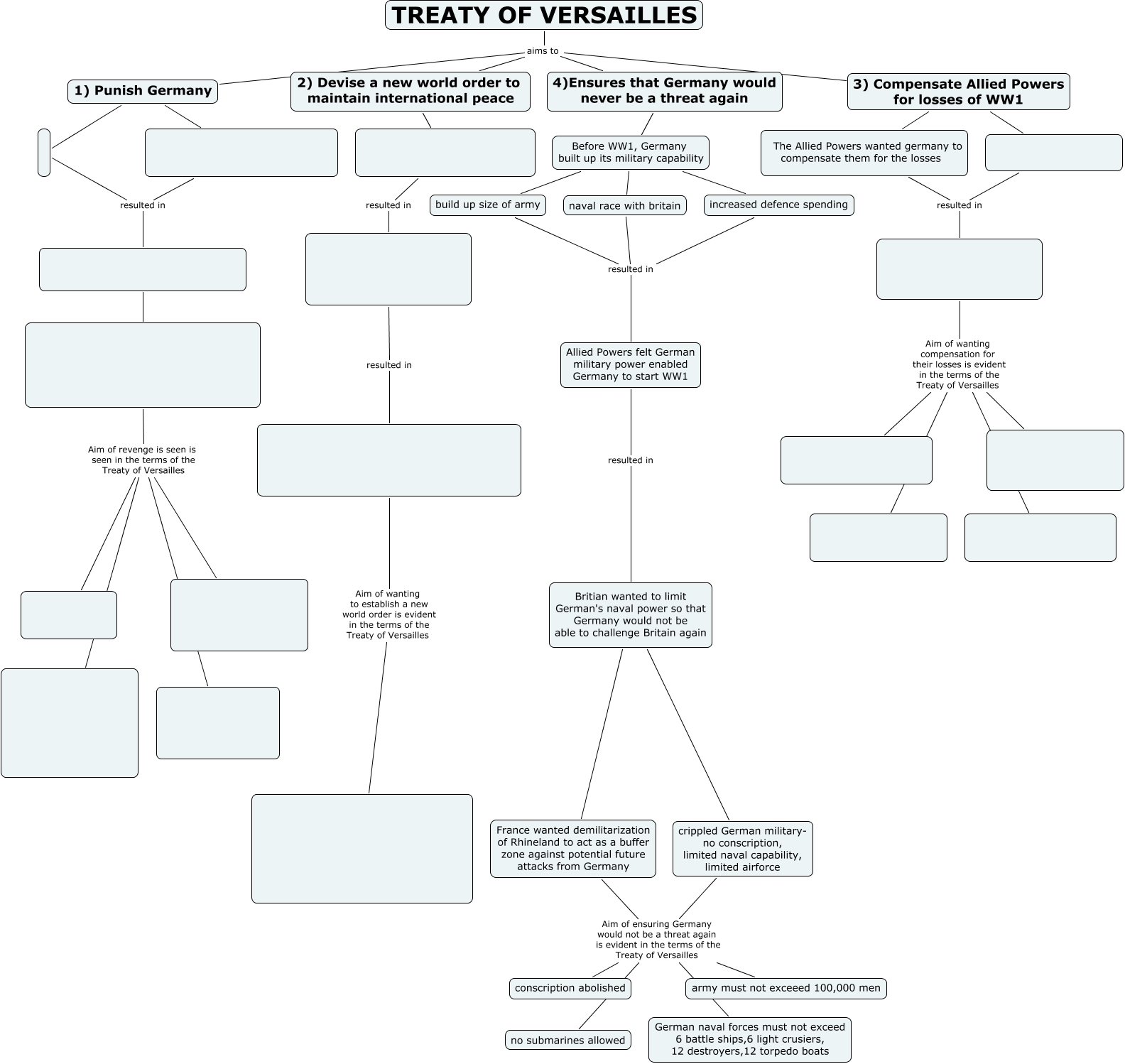 This Concept Map, created with IHMC CmapTools, has information related to: 3J Braynard, Britian wanted to limit German's naval power so that Germany would not be able to challenge Britain again France wanted demilitarization of Rhineland to act as a buffer zone against potential future attacks from Germany, resulted in, Before WW1, Germany built up its military capability naval race with britain, 1) Punish Germany, Britian wanted to limit German's naval power so that Germany would not be able to challenge Britain again crippled German military- no conscription, limited naval capability, limited airforce, TREATY OF VERSAILLES aims to 4)Ensures that Germany would never be a threat again, France wanted demilitarization of Rhineland to act as a buffer zone against potential future attacks from Germany Aim of ensuring Germany would not be a threat again is evident in the terms of the Treaty of Versailles German naval forces must not exceed 6 battle ships,6 light crusiers, 12 destroyers,12 torpedo boats, TREATY OF VERSAILLES aims to 1) Punish Germany, France wanted demilitarization of Rhineland to act as a buffer zone against potential future attacks from Germany Aim of ensuring Germany would not be a threat again is evident in the terms of the Treaty of Versailles conscription abolished, Aim of revenge is seen is seen in the terms of the Treaty of Versailles, Before WW1, Germany built up its military capability build up size of army, Aim of wanting compensation for their losses is evident in the terms of the Treaty of Versailles, France wanted demilitarization of Rhineland to act as a buffer zone against potential future attacks from Germany Aim of ensuring Germany would not be a threat again is evident in the terms of the Treaty of Versailles army must not exceeed 100,000 men, resulted in, Aim of wanting compensation for their losses is evident in the terms of the Treaty of Versailles, The Allied Powers wanted germany to compensate them for the losses resulted in, Aim of wanting compensation for their losses is evident in the terms of the Treaty of Versailles, resulted in, crippled German military- no conscription, limited naval capability, limited airforce Aim of ensuring Germany would not be a threat again is evident in the terms of the Treaty of Versailles army must not exceeed 100,000 men, crippled German military- no conscription, limited naval capability, limited airforce Aim of ensuring Germany would not be a threat again is evident in the terms of the Treaty of Versailles no submarines allowed