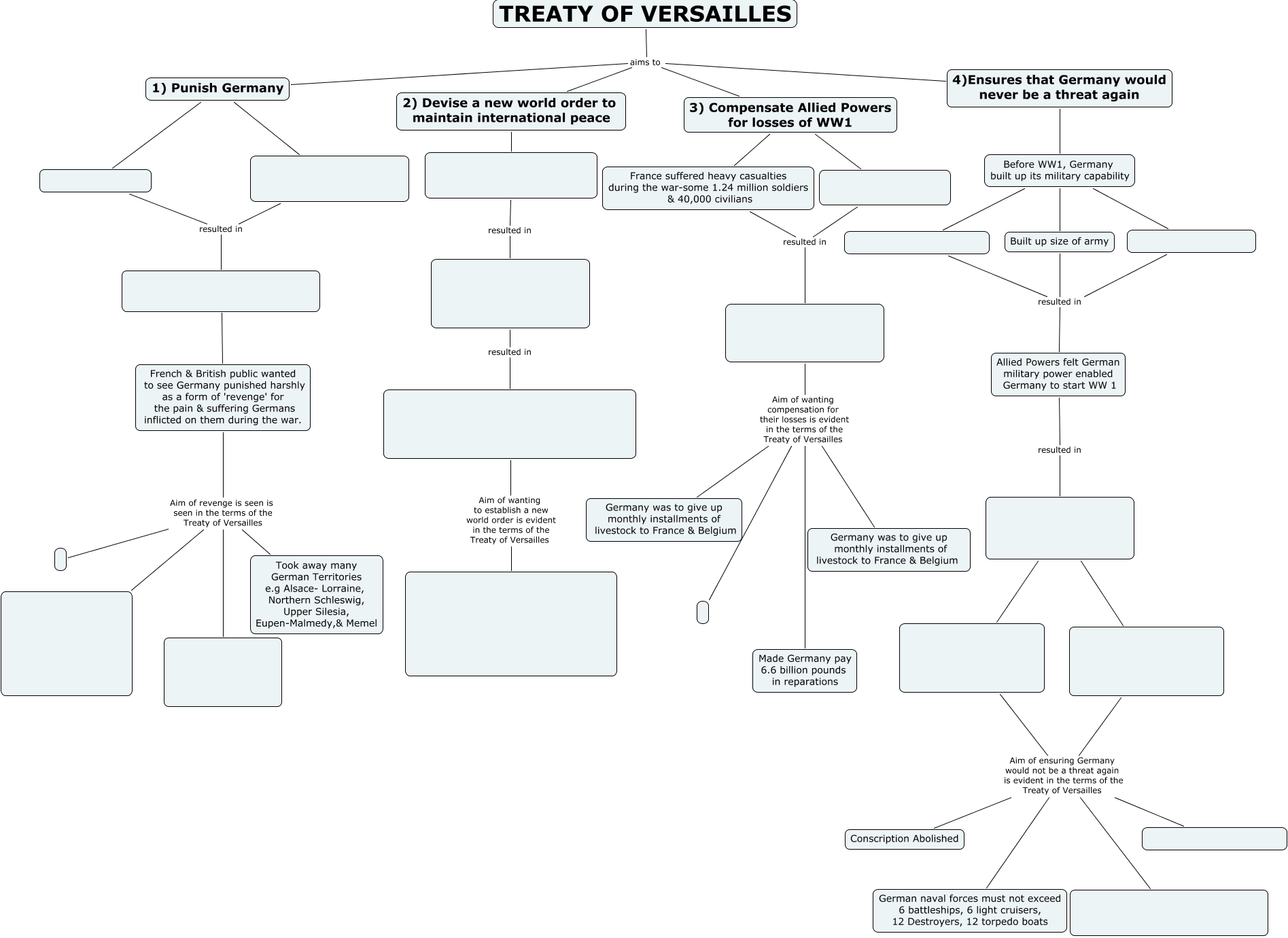 This Concept Map, created with IHMC CmapTools, has information related to: 3I Steve,, resulted in, Before WW1, Germany built up its military capability Built up size of army, 1) Punish Germany,, French & British public wanted to see Germany punished harshly as a form of 'revenge' for the pain & suffering Germans inflicted on them during the war. Aim of revenge is seen is seen in the terms of the Treaty of Versailles, TREATY OF VERSAILLES aims to 4)Ensures that Germany would never be a threat again, Aim of ensuring Germany would not be a threat again is evident in the terms of the Treaty of Versailles, TREATY OF VERSAILLES aims to 1) Punish Germany, Aim of ensuring Germany would not be a threat again is evident in the terms of the Treaty of Versailles Conscription Abolished, Before WW1, Germany built up its military capability, Aim of wanting compensation for their losses is evident in the terms of the Treaty of Versailles, Aim of ensuring Germany would not be a threat again is evident in the terms of the Treaty of Versailles German naval forces must not exceed 6 battleships, 6 light cruisers, 12 Destroyers, 12 torpedo boats, resulted in, Aim of wanting compensation for their losses is evident in the terms of the Treaty of Versailles Germany was to give up monthly installments of livestock to France & Belgium, France suffered heavy casualties during the war-some 1.24 million soldiers & 40,000 civilians resulted in, Aim of wanting compensation for their losses is evident in the terms of the Treaty of Versailles Germany was to give up monthly installments of livestock to France & Belgium, resulted in, Aim of ensuring Germany would not be a threat again is evident in the terms of the Treaty of Versailles German naval forces must not exceed 6 battleships, 6 light cruisers, 12 Destroyers, 12 torpedo boats, Aim of ensuring Germany would not be a threat again is evident in the terms of the Treaty of Versailles
