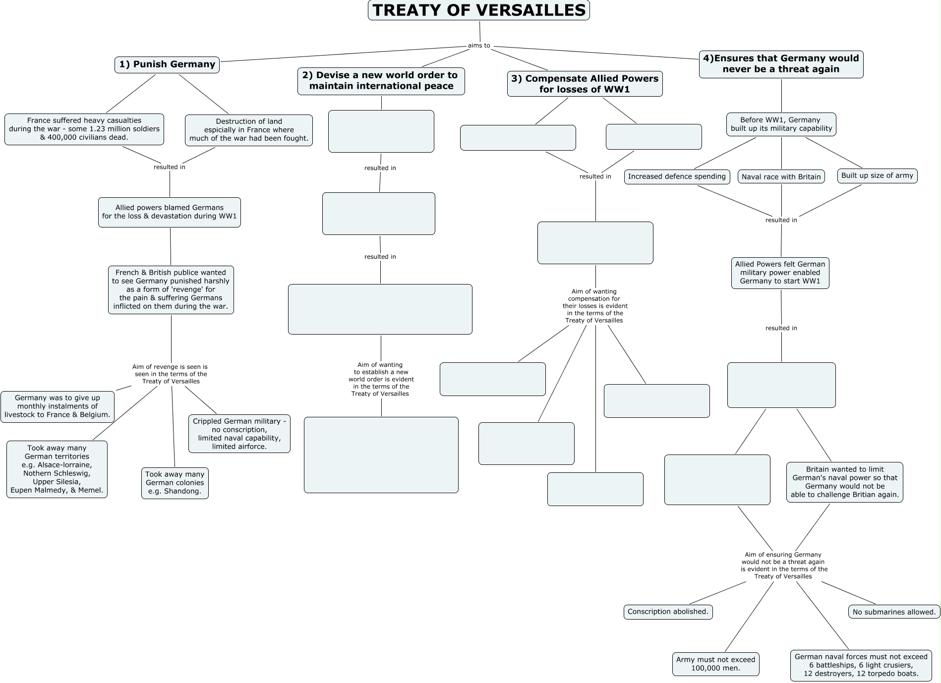 This Concept Map, created with IHMC CmapTools, has information related to: 3J Der Yoh, Britain wanted to limit German's naval power so that Germany would not be able to challenge Britian again., France suffered heavy casualties during the war - some 1.23 million soldiers & 400,000 civilians dead. resulted in Allied powers blamed Germans for the loss & devastation during WW1, Before WW1, Germany built up its military capability Naval race with Britain, 1) Punish Germany France suffered heavy casualties during the war - some 1.23 million soldiers & 400,000 civilians dead.,, TREATY OF VERSAILLES aims to 4)Ensures that Germany would never be a threat again, Britain wanted to limit German's naval power so that Germany would not be able to challenge Britian again. Aim of ensuring Germany would not be a threat again is evident in the terms of the Treaty of Versailles German naval forces must not exceed 6 battleships, 6 light crusiers, 12 destroyers, 12 torpedo boats., TREATY OF VERSAILLES aims to 1) Punish Germany, Britain wanted to limit German's naval power so that Germany would not be able to challenge Britian again. Aim of ensuring Germany would not be a threat again is evident in the terms of the Treaty of Versailles Conscription abolished., French & British publice wanted to see Germany punished harshly as a form of 'revenge' for the pain & suffering Germans inflicted on them during the war. Aim of revenge is seen is seen in the terms of the Treaty of Versailles Germany was to give up monthly instalments of livestock to France & Belgium., Before WW1, Germany built up its military capability Increased defence spending, Aim of wanting compensation for their losses is evident in the terms of the Treaty of Versailles, Britain wanted to limit German's naval power so that Germany would not be able to challenge Britian again. Aim of ensuring Germany would not be a threat again is evident in the terms of the Treaty of Versailles Army must not exceed 100,000 men., Destruction of land espicially in France where much of the war had been fought. resulted in Allied powers blamed Germans for the loss & devastation during WW1, Aim of wanting compensation for their losses is evident in the terms of the Treaty of Versailles, resulted in, Aim of wanting compensation for their losses is evident in the terms of the Treaty of Versailles, resulted in, Aim of ensuring Germany would not be a threat again is evident in the terms of the Treaty of Versailles Army must not exceed 100,000 men., Aim of ensuring Germany would not be a threat again is evident in the terms of the Treaty of Versailles No submarines allowed.