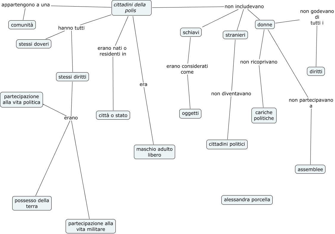 This Concept Map, created with IHMC CmapTools, has information related to: alessandra (rev 2), stessi diritti erano partecipazione alla vita militare, cittadini della polis non includevano donne, stessi diritti erano possesso della terra, cittadini della polis era maschio adulto libero, schiavi erano considerati come oggetti, cittadini della polis non includevano stranieri, cittadini della polis appartengono a una comunità, stranieri non diventavano cittadini politici, cittadini della polis non includevano schiavi, cittadini della polis hanno tutti stessi doveri, cittadini della polis erano nati o residenti in città o stato, cittadini della polis hanno tutti stessi diritti, donne non ricoprivano cariche politiche, donne non partecipavano a assemblee, donne non godevano di tutti i diritti, stessi diritti erano partecipazione alla vita politica