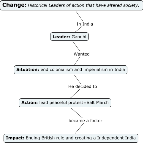 This Concept Map, created with IHMC CmapTools, has information related to: Change- Historical Leaders of action that have altered society-Gandhi, Situation: end colonialism and imperialism in India He decided to Action: lead peaceful protest=Salt March, Leader: Gandhi Wanted Situation: end colonialism and imperialism in India, Action: lead peaceful protest=Salt March became a factor Impact: Ending British rule and creating a Independent India, Change: Historical Leaders of action that have altered society. In India Leader: Gandhi