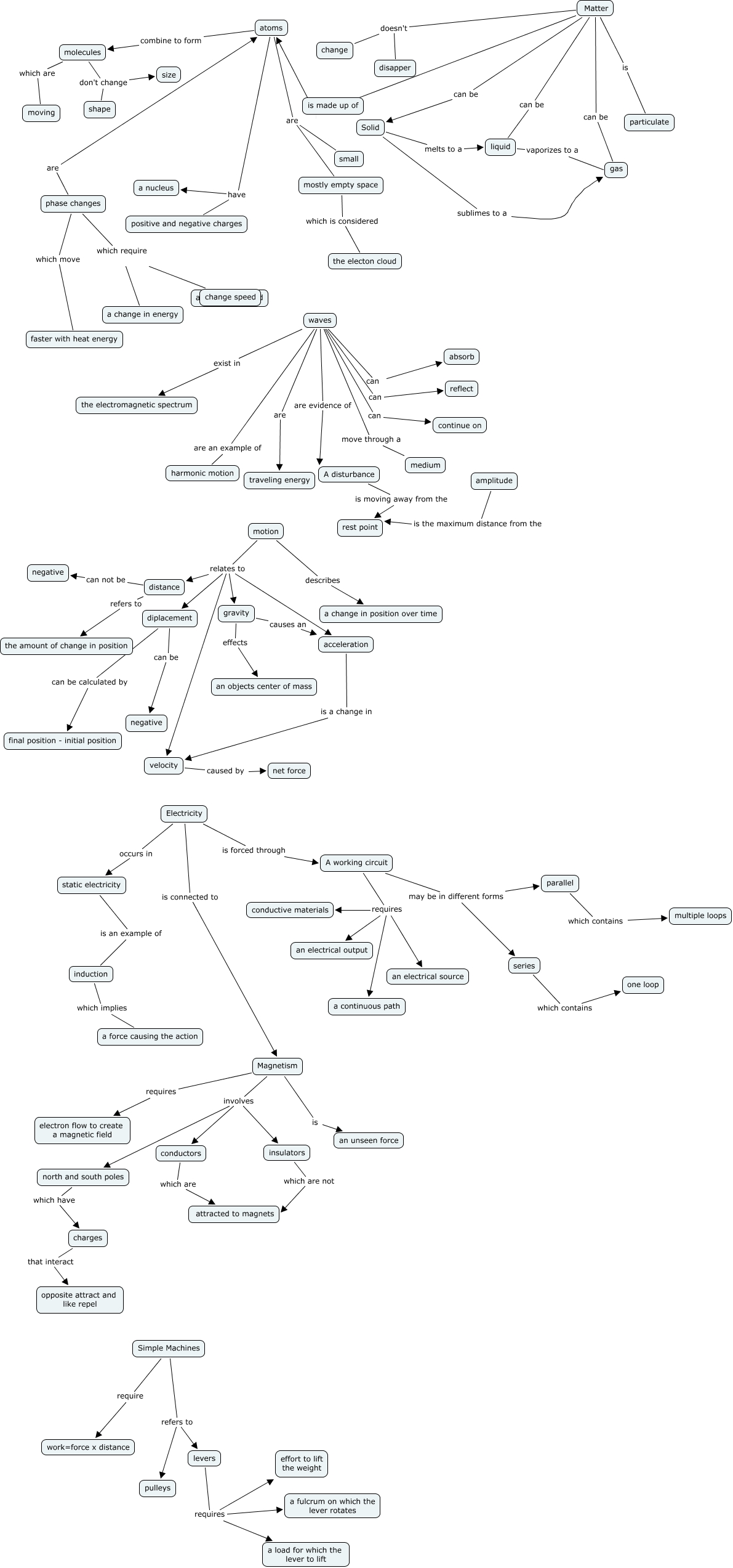 This Concept Map, created with IHMC CmapTools, has information related to: tara, waves are an example of harmonic motion, atoms are small, A working circuit requires a continuous path, liquid vaporizes to a gas, Solid sublimes to a gas, static electricity is an example of induction, motion relates to acceleration, phase changes which move faster with heat energy, Magnetism involves north and south poles, diplacement can be negative, amplitude is the maximum distance from the rest point, Matter doesn't change, parallel which contains multiple loops, levers requires a fulcrum on which the lever rotates, Matter can be gas, A disturbance is moving away from the rest point, Electricity is forced through A working circuit, levers requires a load for which the lever to lift, mostly empty space which is considered the electon cloud, Matter atoms