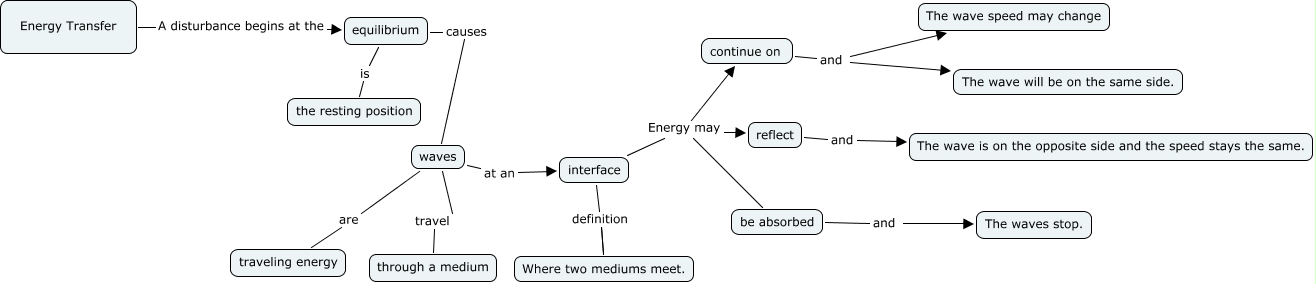 This Concept Map, created with IHMC CmapTools, has information related to: Waves Jodi, reflect and The wave is on the opposite side and the speed stays the same., equilibrium causes waves, equilibrium is the resting position, continue on and The wave will be on the same side., interface Energy may reflect, be absorbed and The waves stop., continue on and The wave speed may change, interface Energy may be absorbed, waves are traveling energy, waves at an interface, interface Energy may continue on, interface definition Where two mediums meet., Energy Transfer A disturbance begins at the equilibrium, waves travel through a medium