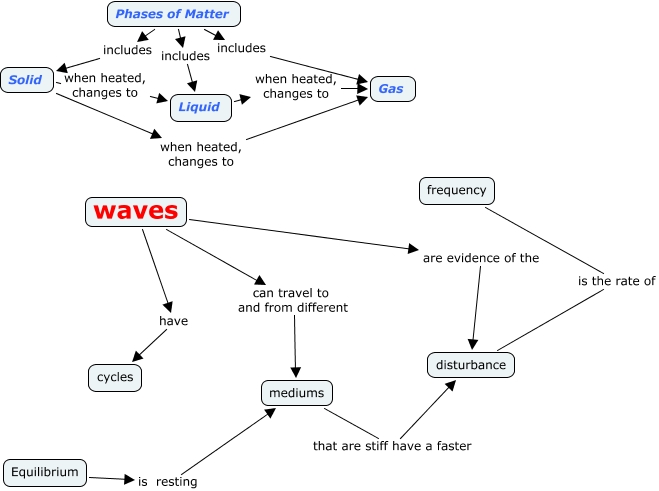 This Concept Map, created with IHMC CmapTools, has information related to: Trish Budd, Phases of Matter includes Liquid, waves are evidence of the disturbance, Liquid when heated, changes to Gas, Solid when heated, changes to Liquid, frequency is the rate of disturbance, waves can travel to and from different mediums, waves have cycles, Phases of Matter includes Gas, Phases of Matter includes Solid, mediums that are stiff have a faster disturbance, Equilibrium is resting mediums, Solid when heated, changes to Gas