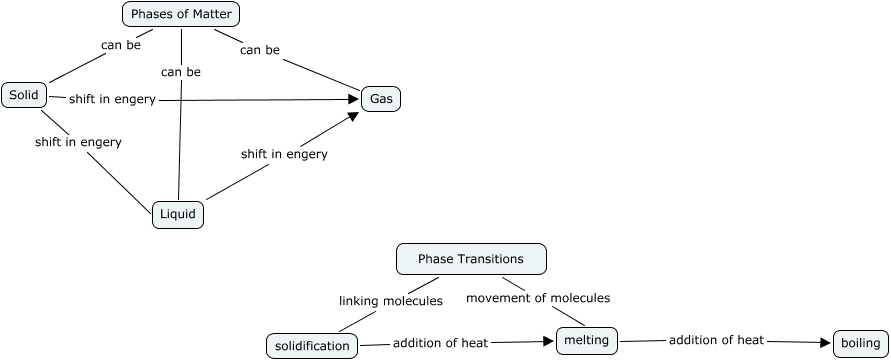 This Concept Map, created with IHMC CmapTools, has information related to: Lani day 2 matter, Phases of Matter can be Gas, melting addition of heat boiling, Solid shift in engery Liquid, Solid shift in engery Gas, Phases of Matter can be Liquid, Phases of Matter can be Solid, solidification addition of heat melting, Phase Transitions movement of molecules melting, Phase Transitions linking molecules solidification, Liquid shift in engery Gas