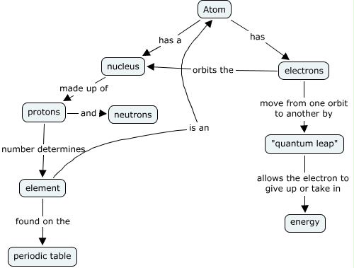 This Concept Map, created with IHMC CmapTools, has information related to: Gwen - Atoms, electrons orbits the nucleus, protons number determines element, electrons move from one orbit to another by "quantum leap", "quantum leap" allows the electron to give up or take in energy, element found on the periodic table, protons and neutrons, element is an Atom, nucleus made up of protons, Atom has electrons, Atom has a nucleus