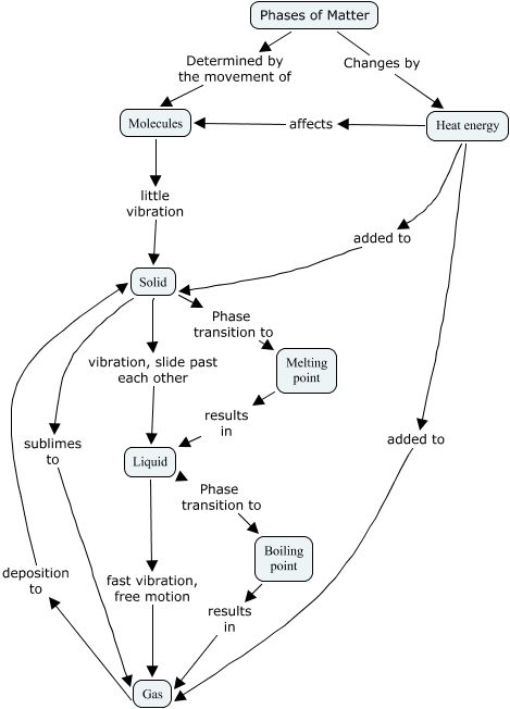 This Concept Map, created with IHMC CmapTools, has information related to: Lynn B phases, Solid Phase transition to Melting point, Gas deposition to Solid, Heat energy added to Solid, Melting point results in Liquid, Solid sublimes to Gas, Liquid fast vibration, free motion Gas, Boiling point results in Gas, Phases of Matter Changes by Heat energy, Solid vibration, slide past each other Liquid, Heat energy affects Molecules, Molecules little vibration Solid, Heat energy added to Gas, Liquid Phase transition to Boiling point, Phases of Matter Determined by the movement of Molecules