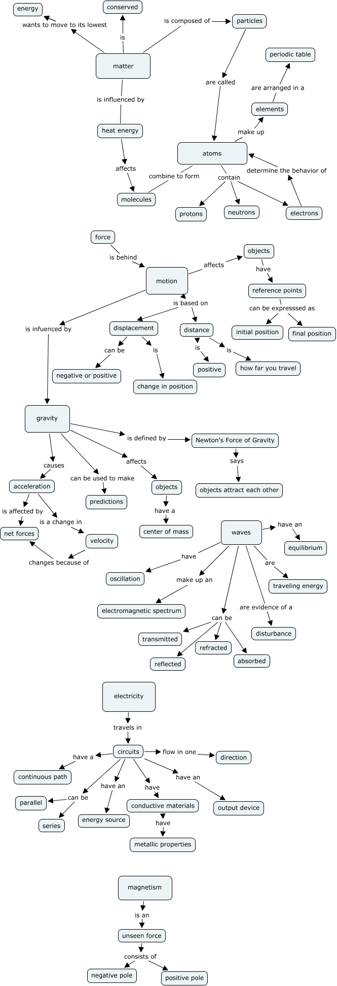 This Concept Map, created with IHMC CmapTools, has information related to: Pam Lieb's Physical Science Map, motion is based on displacement, circuits have conductive materials, waves are evidence of a disturbance, waves are traveling energy, acceleration is a change in velocity, magnetism is an unseen force, reference points can be expresssed as initial position, waves make up an electromagnetic spectrum, atoms contain protons, force is behind motion, gravity can be used to make predictions, circuits have an output device, particles are called atoms, electricity travels in circuits, matter is composed of particles, circuits can be parallel, matter wants to move to its lowest energy, distance is positive, motion affects objects, heat energy affects molecules