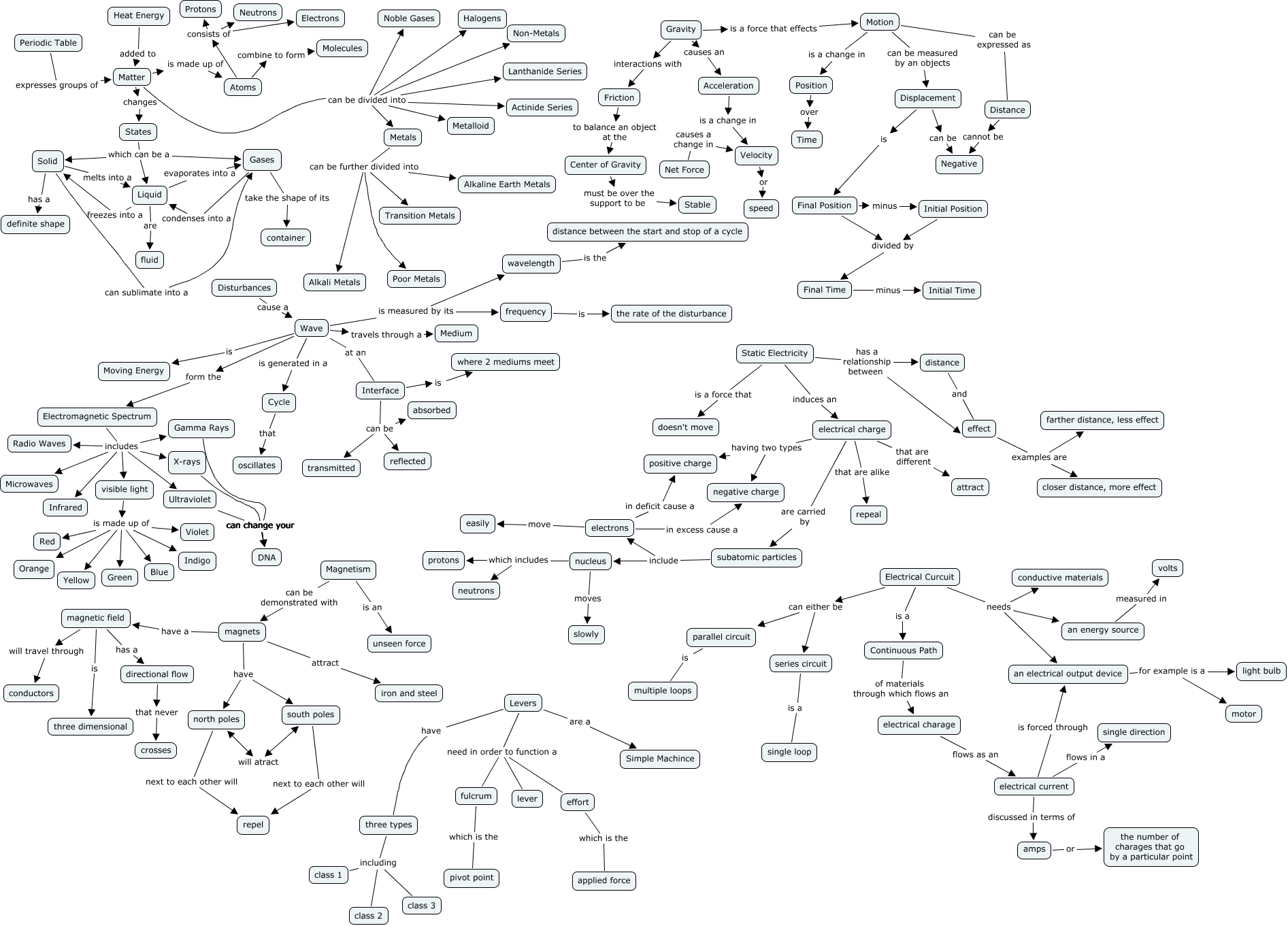 This Concept Map, created with IHMC CmapTools, has information related to: Melinda's Map, Electromagnetic Spectrum includes X-rays, Liquid are fluid, Liquid freezes into a Solid, Center of Gravity must be over the support to be Stable, Displacement is Final Position, Static Electricity induces an electrical charge, Electromagnetic Spectrum includes Infrared, Cycle that oscillates, an electrical output device for example is a light bulb, Interface can be reflected, magnetic field is three dimensional, Electromagnetic Spectrum includes visible light, effort which is the applied force, Levers have three types, Electromagnetic Spectrum includes Ultraviolet, directional flow that never crosses, Electrical Curcuit needs an energy source, visible light is made up of Red, Wave travels through a Medium, Ultraviolet can change your DNA