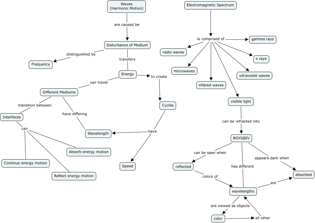 This Concept Map, created with IHMC CmapTools, has information related to: Lani day 4 electromagnetic spectrum, Electromagnetic Spectrum is comprised of gamma rays, Disturbance of Medium distinguished by Frequency, Interfaces can Absorb energy motion, Energy to create Cycles, Interfaces can Continue energy motion, Energy can travel Different Mediums, visible light can be refracted into ROYGBIV, Cycles have Speed, ROYGBIV appears dark when absorbed, wavelengths are absorbed, Different Mediums transition between Interfaces, Electromagnetic Spectrum is comprised of visible light, Electromagnetic Spectrum is comprised of ultraviolet waves, Electromagnetic Spectrum is comprised of x rays, Different Mediums have differing Wavelength, Interfaces can Reflect energy motion, Electromagnetic Spectrum is comprised of radio waves, reflected colors of wavelengths, Waves (Harmonic Motion) are caused be Disturbance of Medium, ROYGBIV has different wavelengths