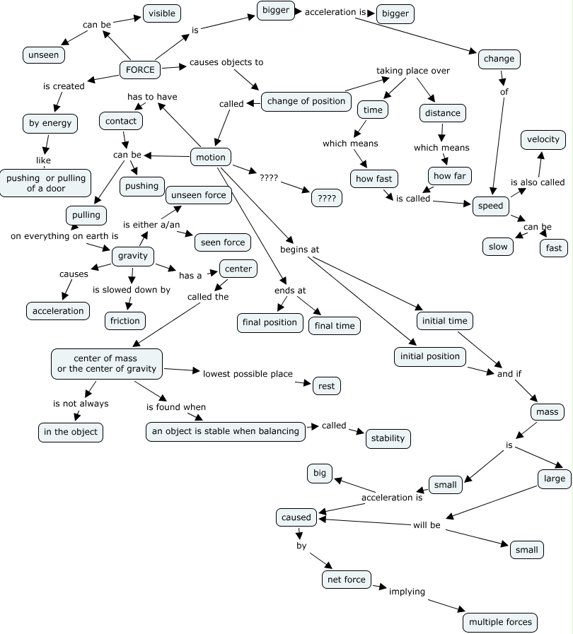 This Concept Map, created with IHMC CmapTools, has information related to: Deb's map 3 force and matter, time which means how fast, center of mass or the center of gravity is found when an object is stable when balancing, caused by net force, speed can be slow, motion ends at final position, bigger acceleration is bigger, gravity has a center, motion ends at final time, small acceleration is big, FORCE is created by energy, initial position and if mass, center of mass or the center of gravity is not always in the object, by energy like pushing or pulling of a door, speed can be fast, bigger acceleration is change, small acceleration is caused, FORCE is bigger, motion begins at initial position, gravity is slowed down by friction, mass is large