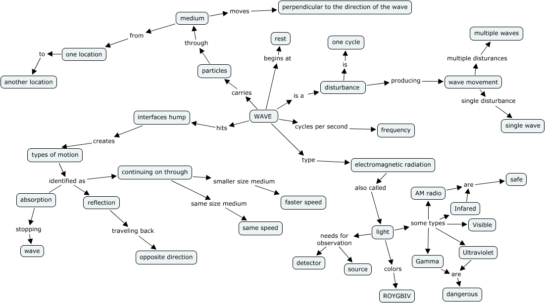 This Concept Map, created with IHMC CmapTools, has information related to: Deb's map 2 waves and light, electromagnetic radiation also called light, WAVE hits interfaces hump, light some types Infared, light colors ROYGBIV, WAVE type electromagnetic radiation, interfaces hump creates types of motion, light some types Gamma, one location to another location, Infared are safe, light some types Ultraviolet, Gamma are dangerous, wave movement multiple disturances multiple waves, Ultraviolet are dangerous, types of motion identified as reflection, WAVE is a disturbance, WAVE cycles per second frequency, medium from one location, continuing on through smaller size medium faster speed, types of motion identified as continuing on through, AM radio are safe