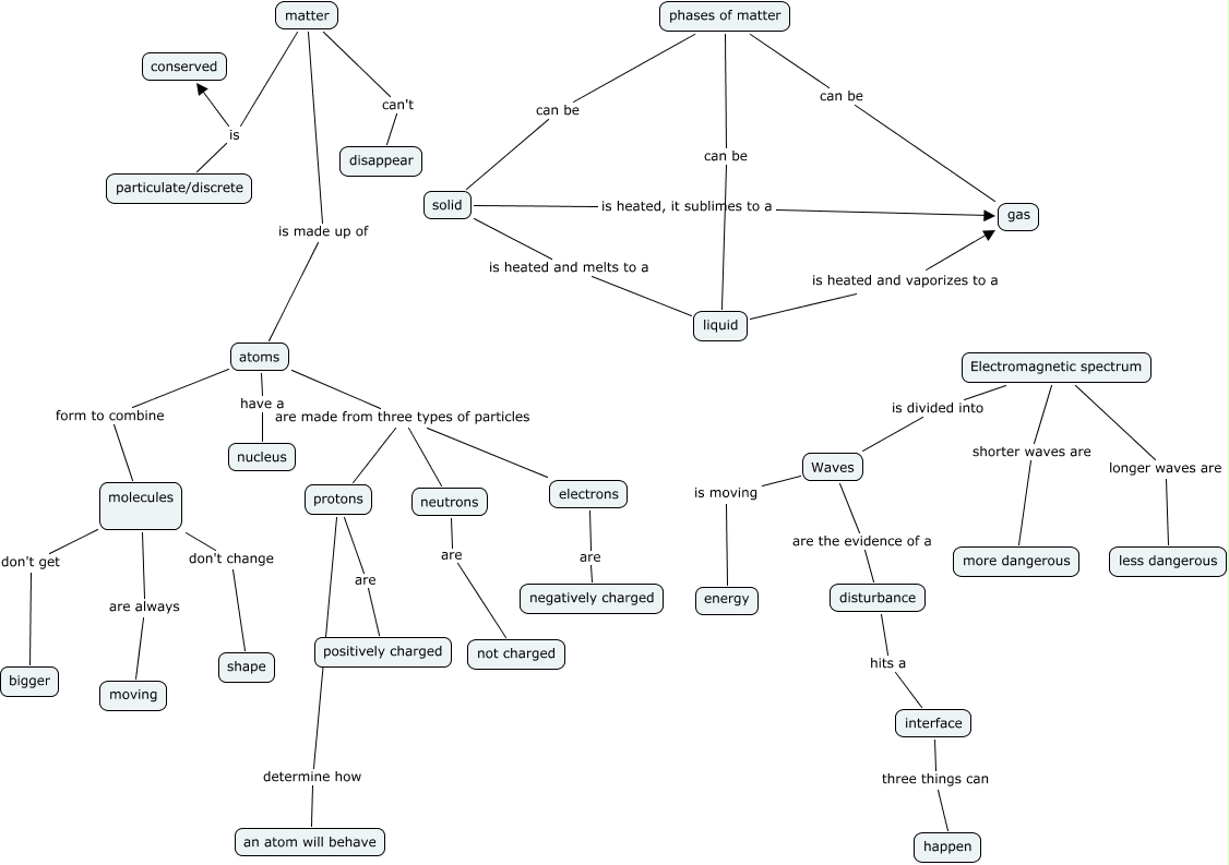 This Concept Map, created with IHMC CmapTools, has information related to: Peggy cmap, neutrons are not charged, matter can't disappear, Electromagnetic spectrum is divided into Waves, disturbance hits a interface, protons determine how an atom will behave, protons are positively charged, Electromagnetic spectrum longer waves are less dangerous, matter is particulate/discrete, matter is made up of atoms, Waves are the evidence of a disturbance, atoms form to combine molecules, molecules don't get bigger, atoms are made from three types of particles neutrons, matter is conserved, electrons are negatively charged, phases of matter can be gas, solid is heated, it sublimes to a gas, Electromagnetic spectrum shorter waves are more dangerous, molecules are always moving, molecules don't change shape