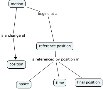 This Concept Map, created with IHMC CmapTools, has information related to: Karen motion, reference position is referenced by position in final position, motion is a change of position, motion begins at a reference position, reference position is referenced by position in time, reference position is referenced by position in space