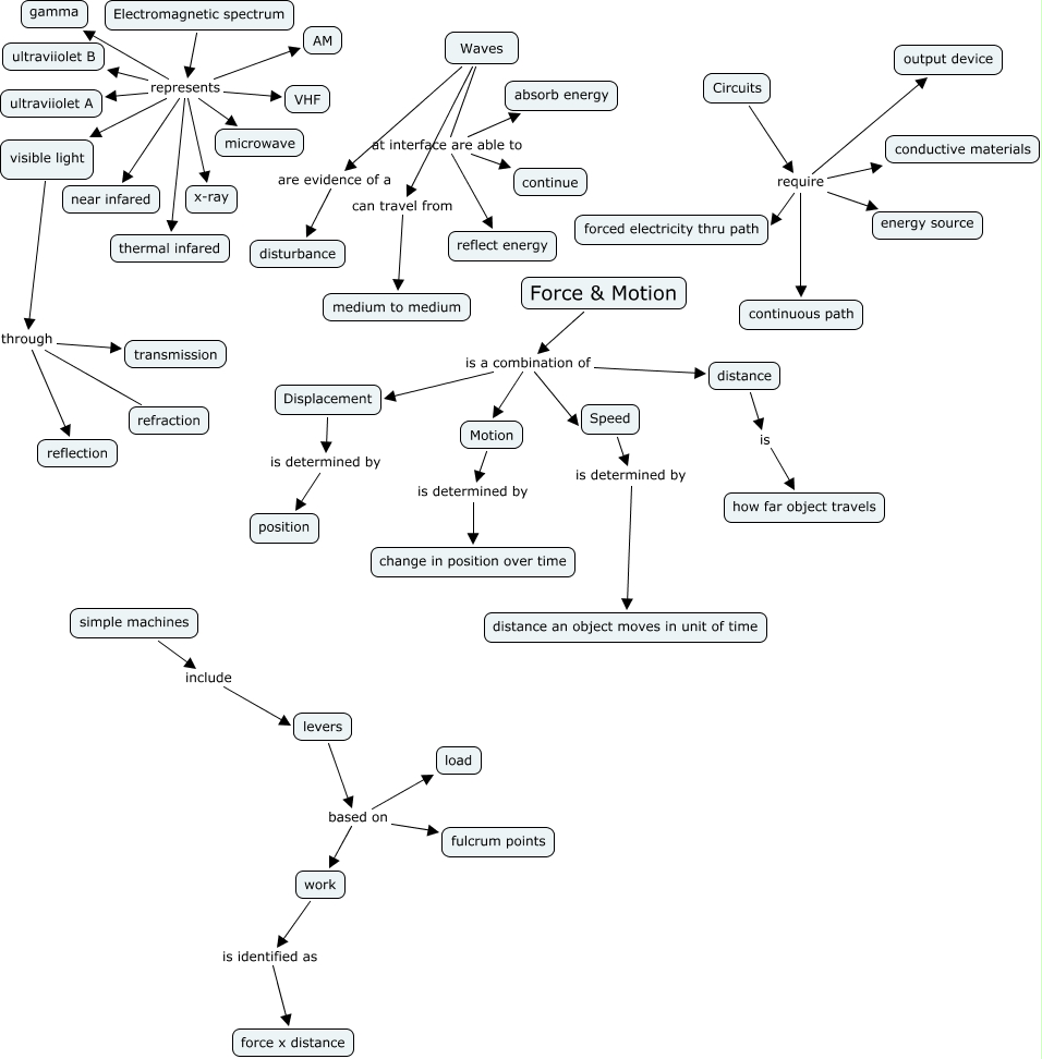 This Concept Map, created with IHMC CmapTools, has information related to: Laura's waves & motion, Displacement is determined by position, Waves at interface are able to reflect energy, Electromagnetic spectrum represents VHF, Force & Motion is a combination of Displacement, Electromagnetic spectrum represents thermal infared, work is identified as force x distance, Waves are evidence of a disturbance, Waves at interface are able to continue, Speed is determined by distance an object moves in unit of time, Electromagnetic spectrum represents ultraviiolet A, Circuits require conductive materials, Circuits require continuous path, visible light through reflection, levers based on fulcrum points, distance is how far object travels, visible light through transmission, Force & Motion is a combination of Speed, Circuits require output device, levers based on load, Force & Motion is a combination of distance
