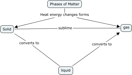 This Concept Map, created with IHMC CmapTools, has information related to: deb sims matter, Phases of Matter Heat energy changes forms Solid, liquid converts to gas, Phases of Matter Heat energy changes forms gas, Solid converts to liquid
