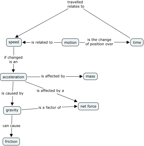 This Concept Map, created with IHMC CmapTools, has information related to: Gwen - Motion, time travelled relates to speed, acceleration is affected by a net force, acceleration is caused by gravity, motion is the change of position over time, gravity is a factor of net force, gravity can cause friction, speed if changed is an acceleration, acceleration is affected by mass, motion is related to speed