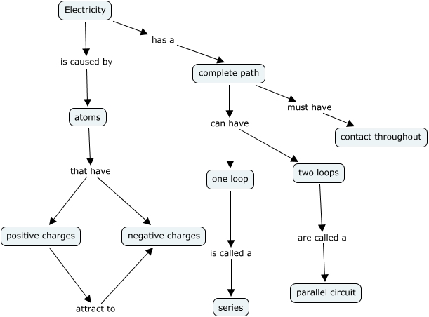 This Concept Map, created with IHMC CmapTools, has information related to: kim's cmap static, atoms that have positive charges, Electricity is caused by atoms, complete path can have one loop, atoms that have negative charges, Electricity has a complete path, two loops are called a parallel circuit, complete path can have two loops, positive charges attract to negative charges, one loop is called a series, complete path must have contact throughout
