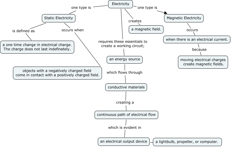 This Concept Map, created with IHMC CmapTools, has information related to: Jodi Electricity, when there is an electrical current. because moving electrical charges create magnetic fields., Electricity requires these essentials to create a working circuit; an energy source, Static Electricity occurs when objects with a negatively charged field come in contact with a positively charged field., an energy source which flows through conductive materials, Electricity one type is Magnetic Electricity, conductive materials creating a continuous path of electrical flow, Static Electricity is defined as a one time change in electrical charge. The charge does not last indefinately., Electricity creates a magnetic field., Magnetic Electricity occurs when there is an electrical current., Electricity one type is Static Electricity, continuous path of electrical flow which is evident in an electrical output device, an electrical output device such as a lightbulb, propeller, or computer.