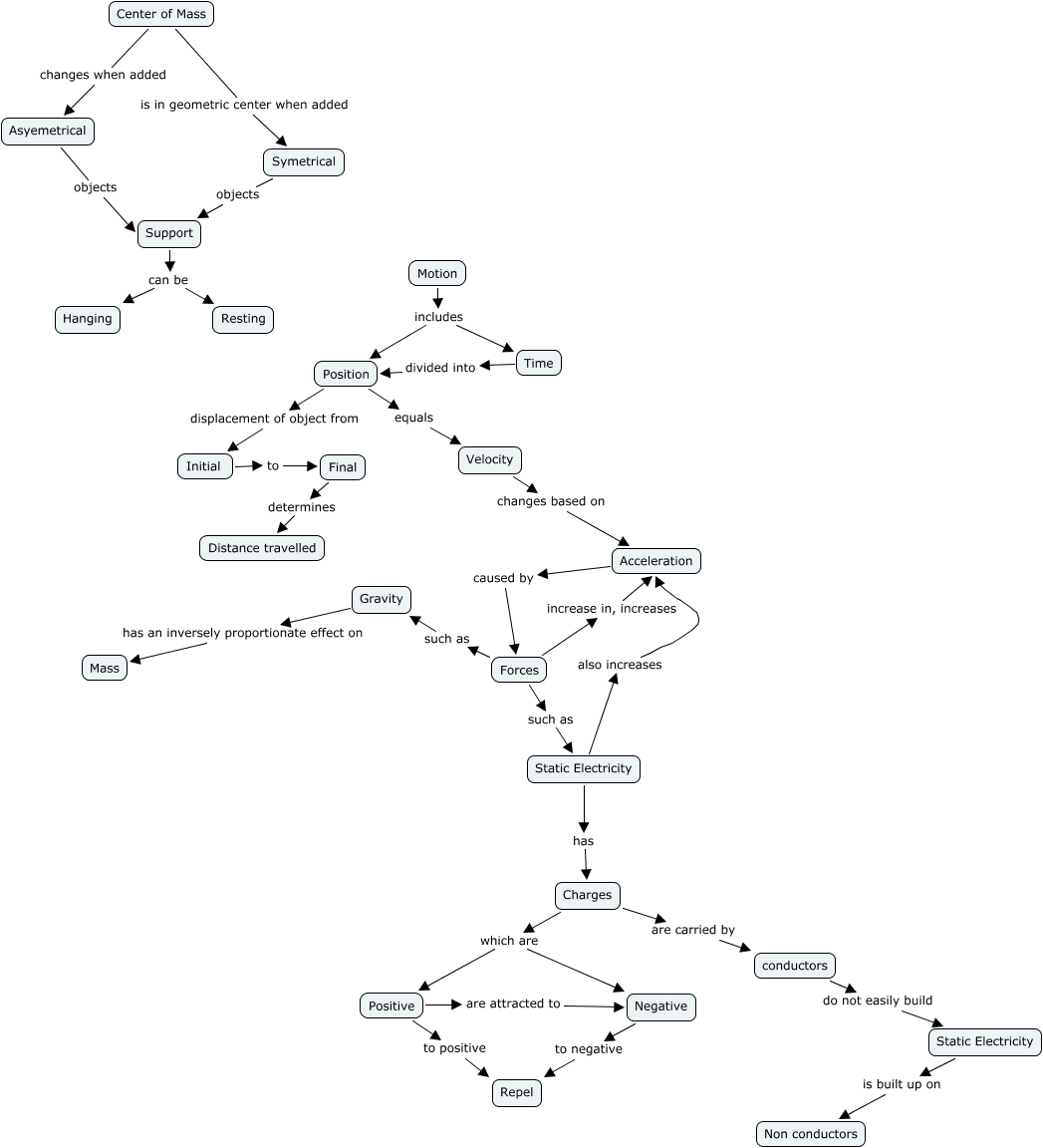This Concept Map, created with IHMC CmapTools, has information related to: Lani Day 6 Charges, Time divided into Position, Position displacement of object from Initial, Symetrical objects Support, Forces such as Static Electricity, Support can be Resting, Motion includes Time, Motion includes Position, Center of Mass changes when added Asyemetrical, Final determines Distance travelled, Static Electricity also increases Acceleration, Positive are attracted to Negative, Support can be Hanging, Forces such as Gravity, Position equals Velocity, Static Electricity has Charges, Velocity changes based on Acceleration, Negative to negative Repel, Acceleration caused by Forces, Positive to positive Repel, Static Electricity is built up on Non conductors
