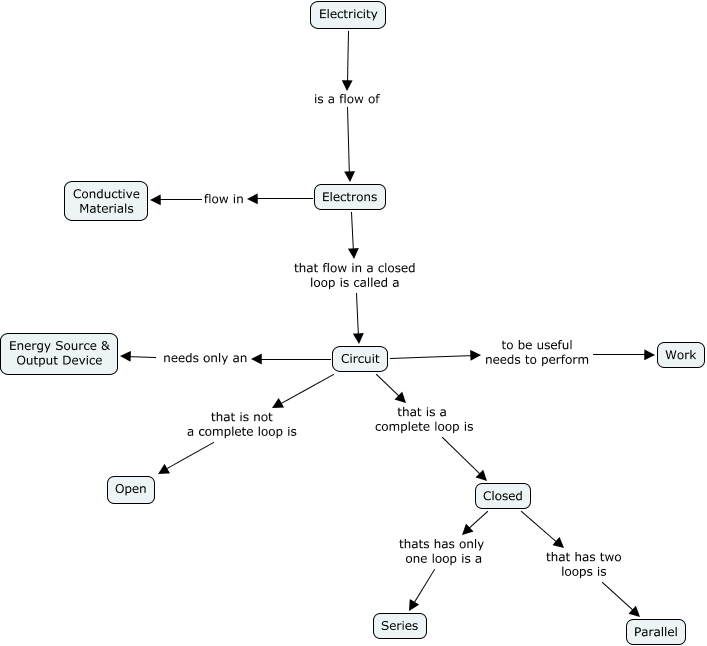This Concept Map, created with IHMC CmapTools, has information related to: Bill - Electricity, Circuit needs only an Energy Source & Output Device, Circuit to be useful needs to perform Work, Closed that has two loops is Parallel, Circuit that is a complete loop is Closed, Electrons that flow in a closed loop is called a Circuit, Electrons flow in Conductive Materials, Circuit that is not a complete loop is Open, Electricity is a flow of Electrons, Closed thats has only one loop is a Series