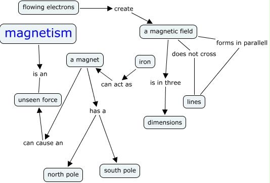 This Concept Map, created with IHMC CmapTools, has information related to: Trish - Magnetism, a magnet can cause an unseen force, a magnetic field forms in parallell lines, a magnet has a south pole, iron can act as a magnet, flowing electrons create a magnetic field, a magnet has a north pole, a magnetic field is in three dimensions, a magnetic field does not cross lines, magnetism is an unseen force