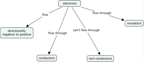 This Concept Map, created with IHMC CmapTools, has information related to: Karen electricity, electrons flow directionally negative to positive, electrons can't flow through non-conductors, electrons flow through insulators, electrons flow through conductors