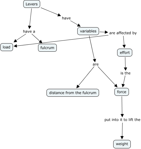 This Concept Map, created with IHMC CmapTools, has information related to: kim's cmap lever, effort is the force, Levers have a fulcrum, Levers have variables, variables are affected by load, force put into it to lift the weight, variables are force, variables are distance from the fulcrum, Levers have a load, variables are affected by effort