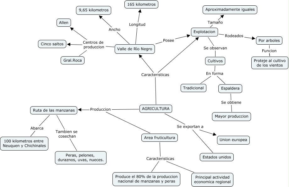 This Concept Map, created with IHMC CmapTools, has information related to: Agricultura (mar, ely, lu), Valle de Rìo Negro Centros de produccion Cinco saltos, Ruta de las manzanas Abarca 100 kilometros entre Neuquen y Chichinales, Cultivos En forma Tradicional, AGRICULTURA Caracteristicas Valle de Rìo Negro, AGRICULTURA Caracteristicas Explotacion, Valle de Rìo Negro Centros de produccion Gral.Roca, AGRICULTURA Se exportan a Estados unidos, AGRICULTURA Produccion Ruta de las manzanas, Valle de Rìo Negro Ancho 9,65 kilometros, AGRICULTURA Produccion Area fruticultura, Explotacion Rodeados Por arboles, Valle de Rìo Negro Posee Explotacion, Area fruticultura Caracteristicas Principal actividad economica regional, Espaldera Se obtiene Mayor produccion, Area fruticultura Caracteristicas Produce el 80% de la produccion nacional de manzanas y peras, Valle de Rìo Negro Centros de produccion Allen, Valle de Rìo Negro Longitud 165 kilometros, Ruta de las manzanas Tambien se cosechan Peras, pelones, duraznos, uvas, nueces., AGRICULTURA Se exportan a Union europea, Explotacion Se observan Cultivos