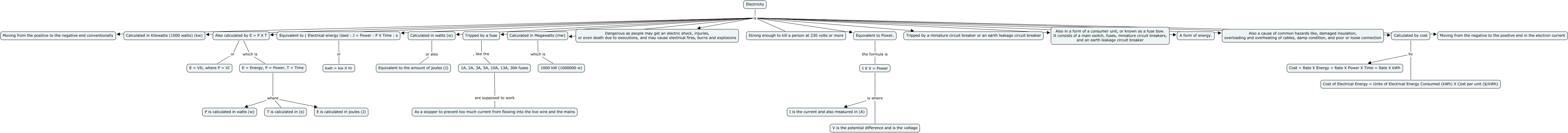 This Concept Map, created with IHMC CmapTools, has information related to: HouseHold Electricity, Calculated by cost by Cost = Rate X Energy = Rate X Power X Time = Rate X kWh, Electricity is Dangerous as people may get an electric shock, injuries, or even death due to executions, and may cause electrical fires, burns and explosions, Electricity is Also a cause of common hazards like, damaged insulation, overloading and overheating of cables, damp condition, and poor or loose connection, Calculated in Megawatts (mw) which is 1000 kW (1000000 w), Also calculated by E = P X T which is E = Energy, P = Power, T = Time, I X V = Power is where V is the potential difference and is the voltage, Electricity is Strong enough to kill a person at 230 volts or more, E = Energy, P = Power, T = Time where P is calculated in watts (w), E = Energy, P = Power, T = Time where E is calculated in joules (J), Electricity is Moving from the negative to the positive end in the electron current, Electricity is A form of energy., Electricity is Also calculated by E = P X T, Also calculated by E = P X T or E = VIt, where P = VI, Electricity is Equivalent to Power,, Electricity is Also in a form of a consumer unit, or known as a fuse bow. It consists of a main switch, fuses, miniature circuit breakers, and an earth leakage circuit breaker, I X V = Power is where I is the current and also measured in (A), Calculated by cost by Cost of Electrical Energy = Units of Electrical Energy Consumed (kWh) X Cost per unit ($/kWh), Electricity is Calculated in Megawatts (mw), Electricity is Tripped by a fuse, Electricity is Moving from the positive to the negative end conventionally