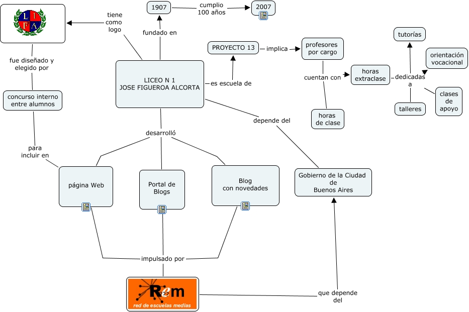 This Concept Map, created with IHMC CmapTools, has information related to: CMAP LICEO 1, 1907 cumplio 100 años 2007, ???? fue diseñado y elegido por concurso interno entre alumnos, Blog con novedades impulsado por ????, profesores por cargo cuentan con horas de clase, Portal de Blogs impulsado por ????, LICEO N 1 JOSE FIGUEROA ALCORTA desarrolló Portal de Blogs, horas extraclase dedicadas a orientación vocacional, LICEO N 1 JOSE FIGUEROA ALCORTA fundado en 1907, profesores por cargo cuentan con horas extraclase, LICEO N 1 JOSE FIGUEROA ALCORTA es escuela de PROYECTO 13, LICEO N 1 JOSE FIGUEROA ALCORTA desarrolló Blog con novedades, LICEO N 1 JOSE FIGUEROA ALCORTA depende del Gobierno de la Ciudad de Buenos Aires, LICEO N 1 JOSE FIGUEROA ALCORTA desarrolló página Web, ???? que depende del Gobierno de la Ciudad de Buenos Aires, PROYECTO 13 implica profesores por cargo, concurso interno entre alumnos para incluir en página Web, horas extraclase dedicadas a tutorías, horas extraclase dedicadas a talleres, horas extraclase dedicadas a clases de apoyo, página Web impulsado por ????