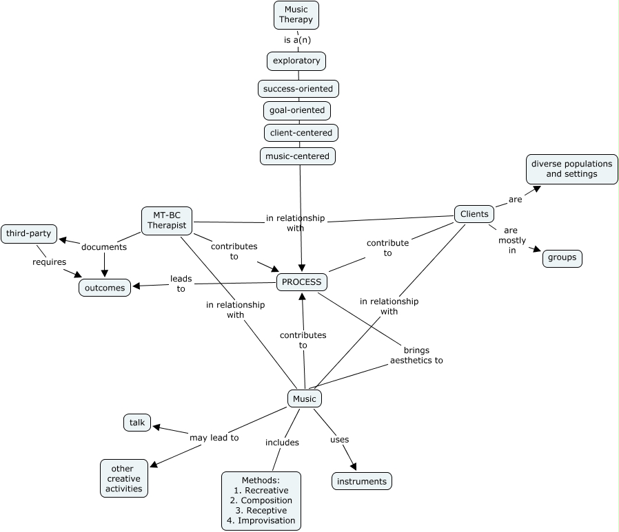 This Concept Map, created with IHMC CmapTools, has information related to: MT in US 2007 June 19, Music includes Methods: 1. Recreative 2. Composition 3. Receptive 4. Improvisation, Music Therapy is a(n) PROCESS, Music uses instruments, Clients in relationship with Music, MT-BC Therapist in relationship with Clients, Music may lead to other creative activities, Music contributes to PROCESS, third-party requires outcomes, Music may lead to talk, Clients are diverse populations and settings, MT-BC Therapist documents third-party, PROCESS brings aesthetics to Music, Clients are mostly in groups, MT-BC Therapist contributes to PROCESS, PROCESS leads to outcomes, MT-BC Therapist in relationship with Music, Clients contribute to PROCESS, MT-BC Therapist documents outcomes