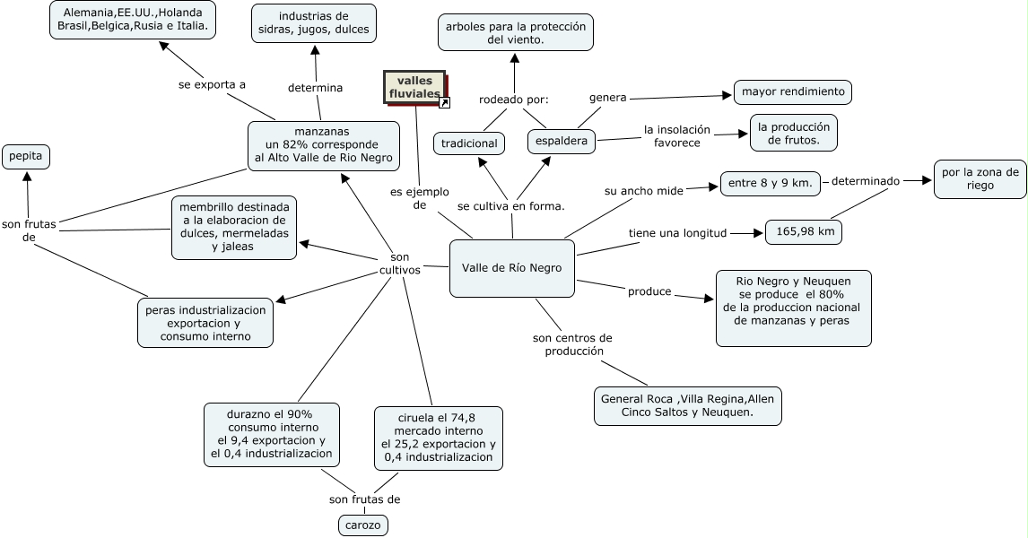 This Concept Map, created with IHMC CmapTools, has information related to: agricultura, manzanas un 82% corresponde al Alto Valle de Rio Negro se exporta a Alemania,EE.UU.,Holanda Brasil,Belgica,Rusia e Italia., durazno el 90% consumo interno el 9,4 exportacion y el 0,4 industrializacion son frutas de carozo, Valle de Río Negro se cultiva en forma. tradicional, membrillo destinada a la elaboracion de dulces, mermeladas y jaleas son frutas de pepita, manzanas un 82% corresponde al Alto Valle de Rio Negro son frutas de pepita, Valle de Río Negro son cultivos ciruela el 74,8 mercado interno el 25,2 exportacion y 0,4 industrializacion, espaldera genera mayor rendimiento, Valle de Río Negro tiene una longitud 165,98 km, peras industrializacion exportacion y consumo interno son frutas de pepita, Valle de Río Negro son cultivos durazno el 90% consumo interno el 9,4 exportacion y el 0,4 industrializacion, Valle de Río Negro su ancho mide entre 8 y 9 km., Valle de Río Negro son cultivos manzanas un 82% corresponde al Alto Valle de Rio Negro, espaldera rodeado por: arboles para la protección del viento., manzanas un 82% corresponde al Alto Valle de Rio Negro determina industrias de sidras, jugos, dulces, valles fluviales es ejemplo de Valle de Río Negro, Valle de Río Negro produce Rio Negro y Neuquen se produce el 80% de la produccion nacional de manzanas y peras, Valle de Río Negro son cultivos peras industrializacion exportacion y consumo interno, 165,98 km determinado por la zona de riego, espaldera la insolación favorece la producción de frutos., tradicional rodeado por: arboles para la protección del viento.